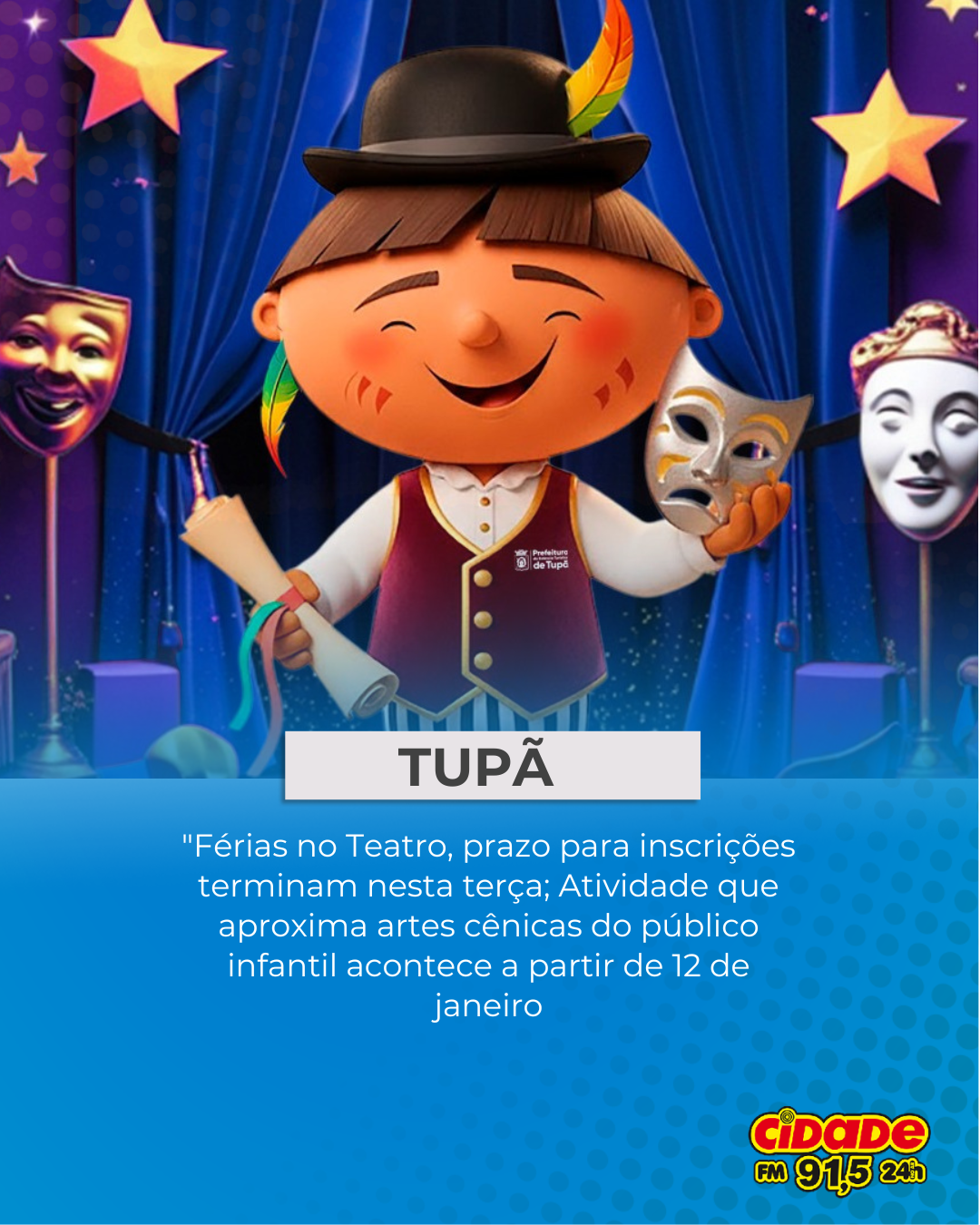 Geral TUPÃ: “Férias no Teatro, prazo para inscrições terminam nesta terça; Atividade que aproxima artes cênicas do público infantil acontece a partir de 12 de janeiro 5 de janeiro de 2026 Nenhum comentário