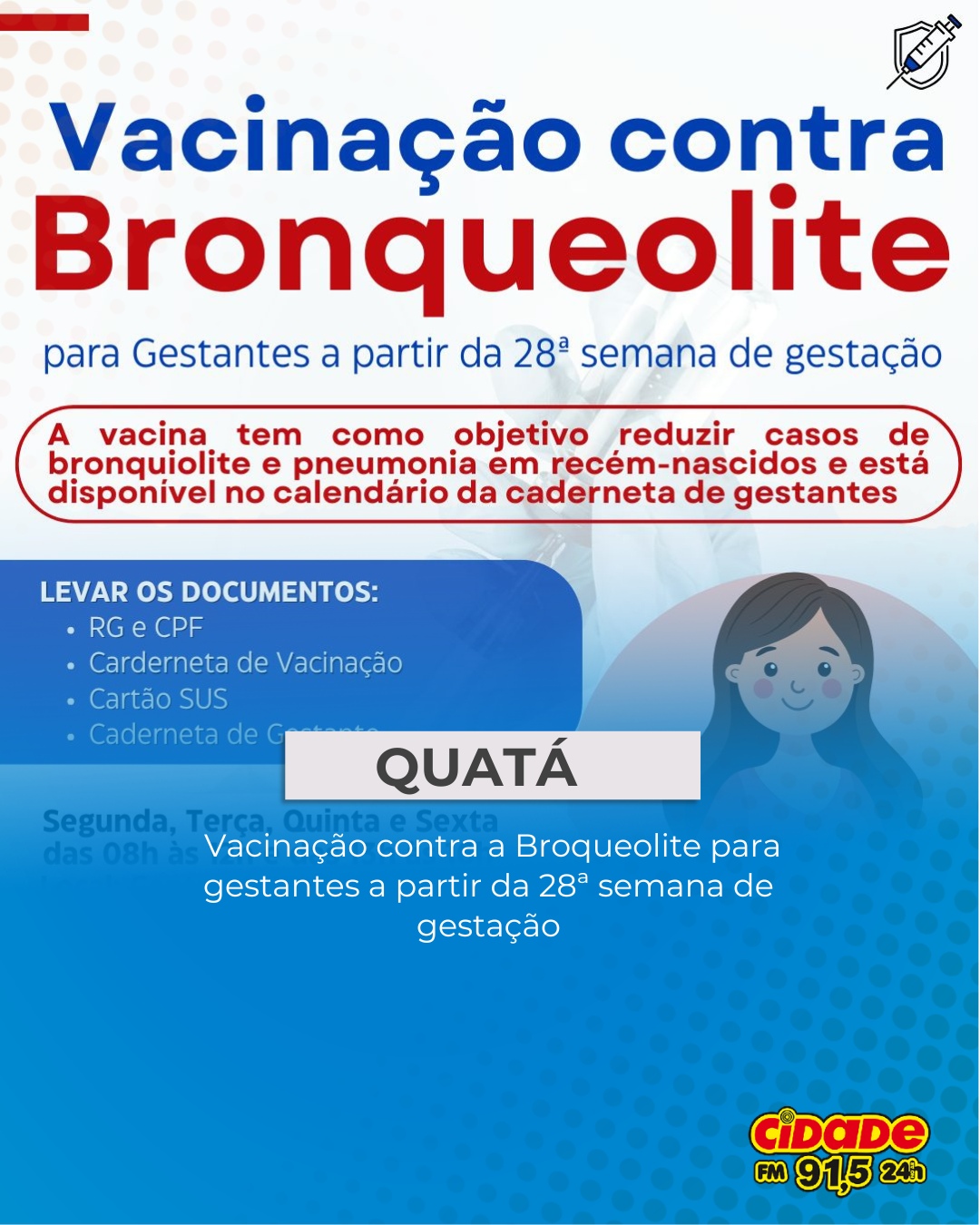 Geral QUATÁ: Vacinação contra a Broqueolite para gestantes a partir da 28ª semana de gestação 5 de janeiro de 2026 Nenhum comentário