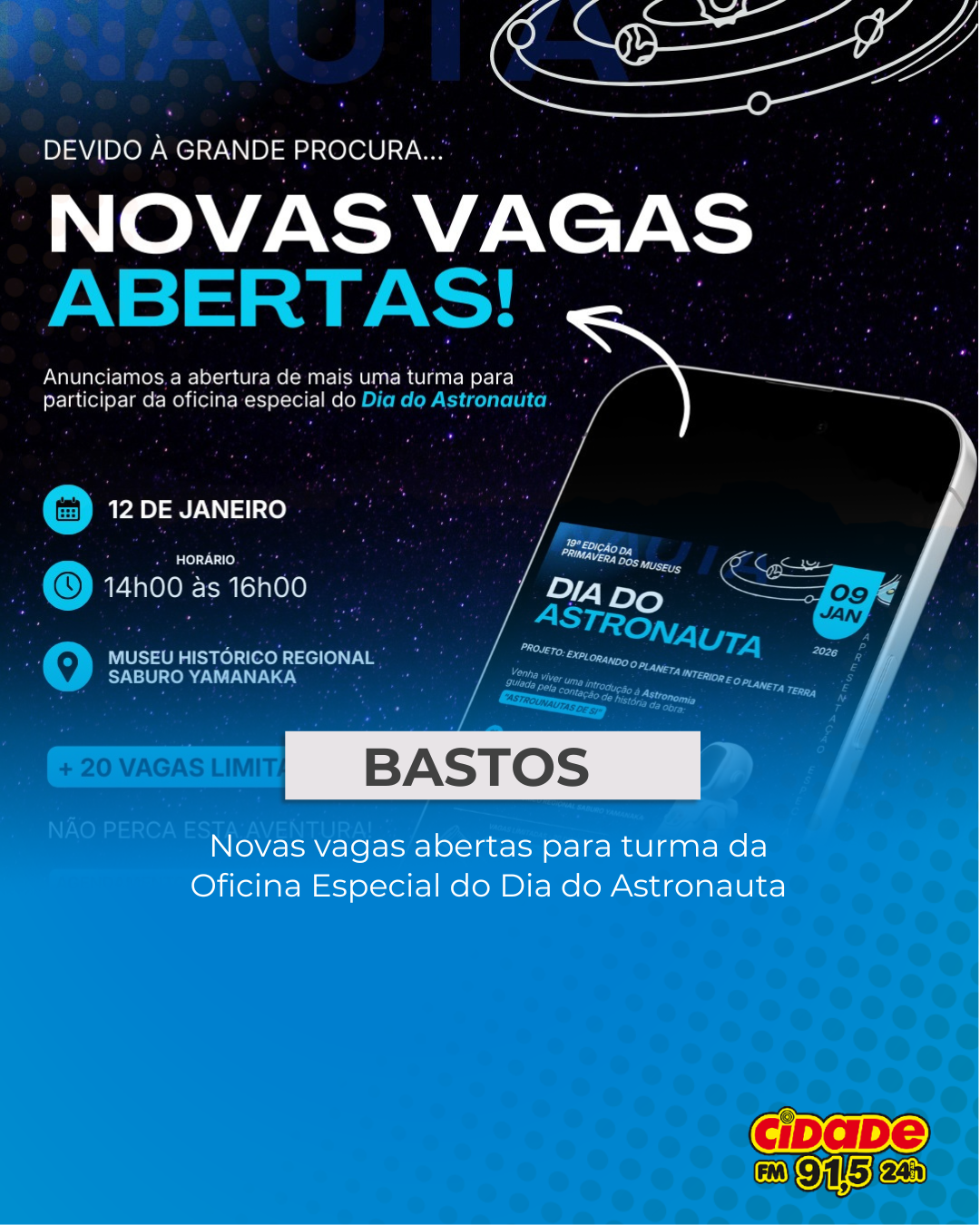 Geral BASTOS: Novas vagas abertas para turma da Oficina Especial do Dia do Astronauta 5 de janeiro de 2026 Nenhum comentário