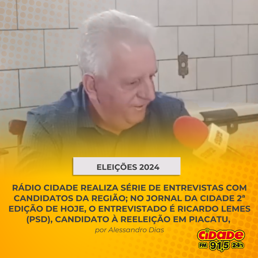 Geral ELEIÇÕES 2024: RÁDIO CIDADE REALIZA SÉRIE DE ENTREVISTAS COM CANDIDATOS DA REGIÃO; NO JORNAL DA CIDADE 2ª EDIÇÃO DE HOJE O ENTREVISTADO É RICARDO LEMES (PSD), CANDIDATO À REELEIÇÃO EM PIACATU 10 de setembro de 2024 Nenhum comentário