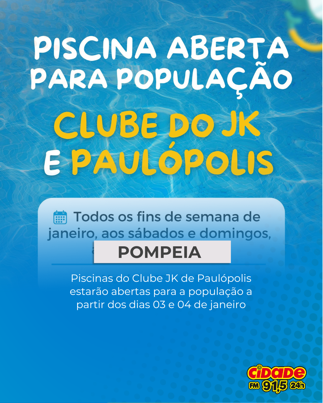 Geral POMPEIA: Piscinas do Clube JK de Paulópolis estarão abertas para a população a partir dos dias 03 e 04 de janeiro 30 de dezembro de 2025 Nenhum comentário