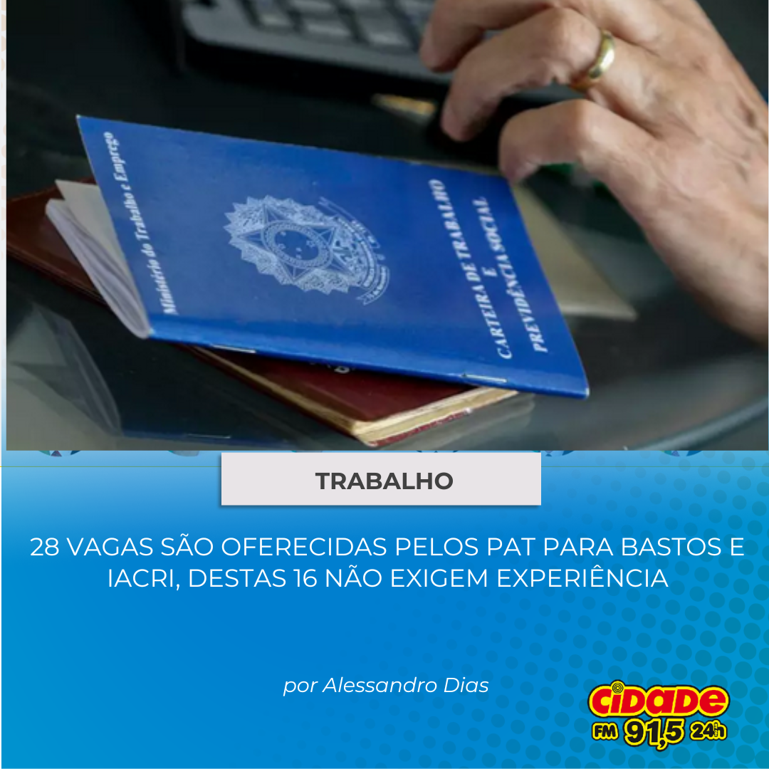 Geral TRABALHO: 28 VAGAS SÃO OFERECIDAS PELO PAT PARA BASTOS E IACRI; 16 NÃO EXIGEM EXPERIÊNCIA 26 de agosto de 2024 Nenhum comentário