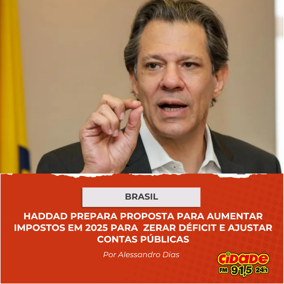 Geral BRASIL: HADDAD PREPARA PROPOSTA PARA AUMENTAR IMPOSTOS EM 2025 PARA ZERAR DÉFICIT E AJUSTAR CONTAS PÚBLICAS 24 de agosto de 2024 Nenhum comentário