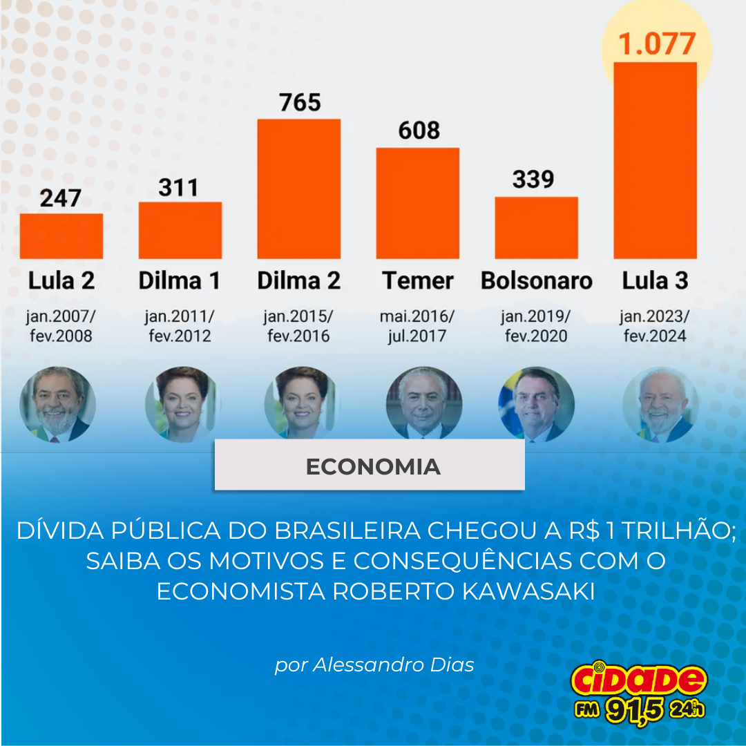 Geral ECONOMIA: DÍVIDA PÚBLICA BRASILEIRA CHEGOU A R$ 1 TRILHÃO; SAIBA OS MOTIVOS E CONSEQUÊNCIAS COM O ECONOMISTA ROBERTO KAWASAKI 22 de agosto de 2024 Nenhum comentário