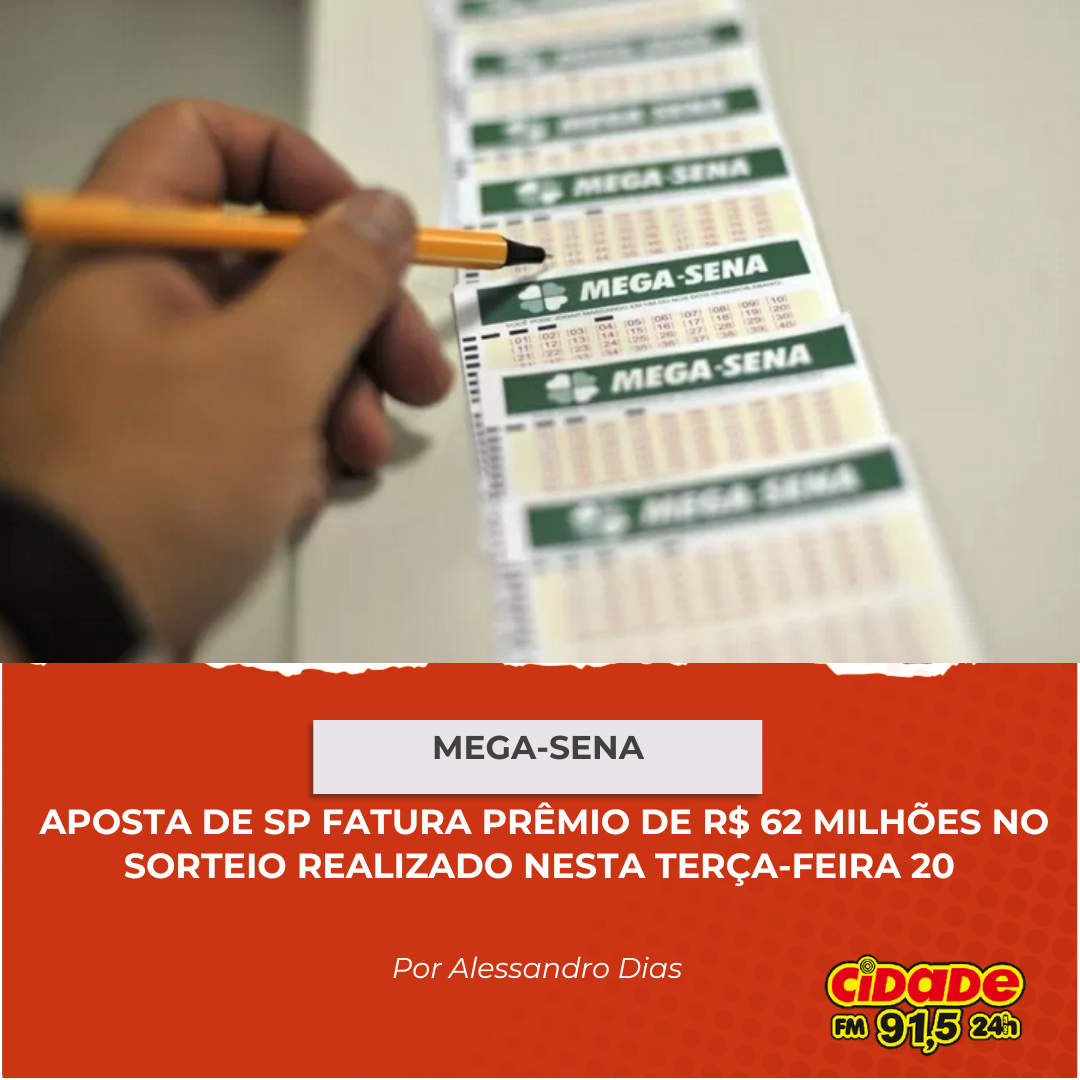 Geral MEGA SENA: APOSTA DE SP FATURA R$ 62 MILHÕES NO SORTEIO REALIZADO NESTA TERÇA-FEIRA 20 21 de agosto de 2024 Nenhum comentário