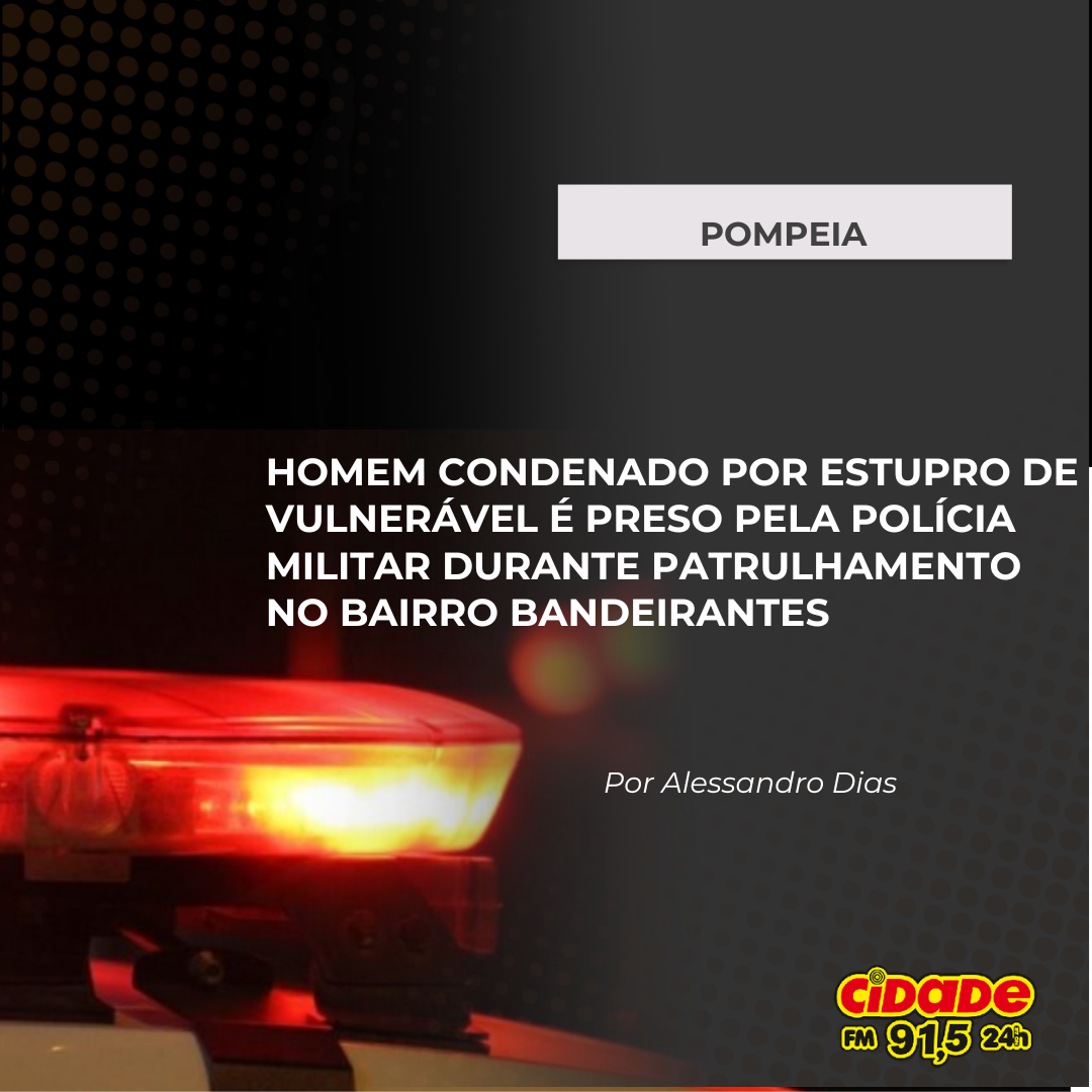 Geral POMPEIA: HOMEM CONDENADO POR ESTUPRO DE VULNERÁVEL É PRESO PELA POLÍCIA MILITAR DURANTE PATRULHAMENTO NO BAIRRO BANDEIRANTES 4 de agosto de 2024 Nenhum comentário