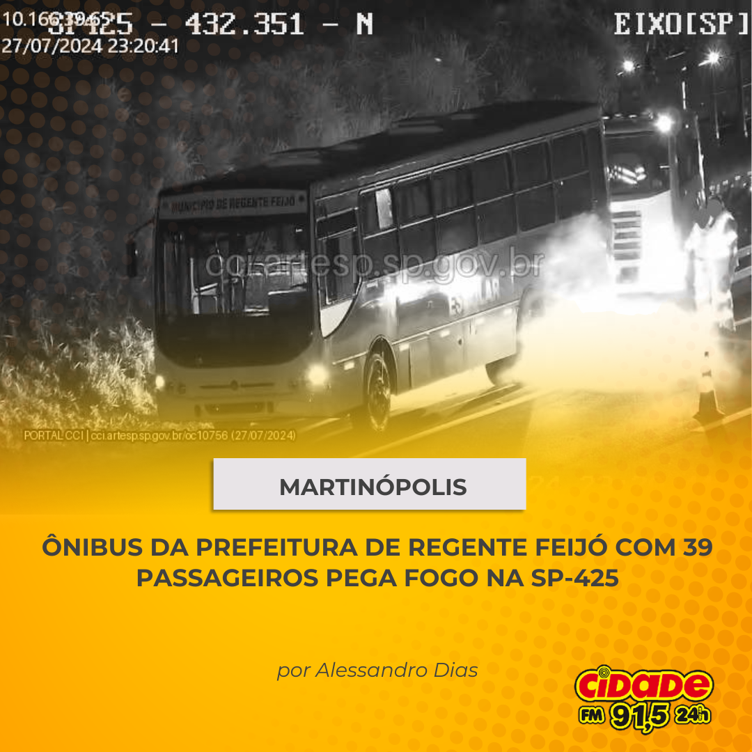 Geral MARTINÓPOLIS: ÔNIBUS DA PREFEITURA DE REGENTE FEIJÓ COM 39 PASSAGEIROS PEGA FOGO NA SP-425 30 de julho de 2024 Nenhum comentário