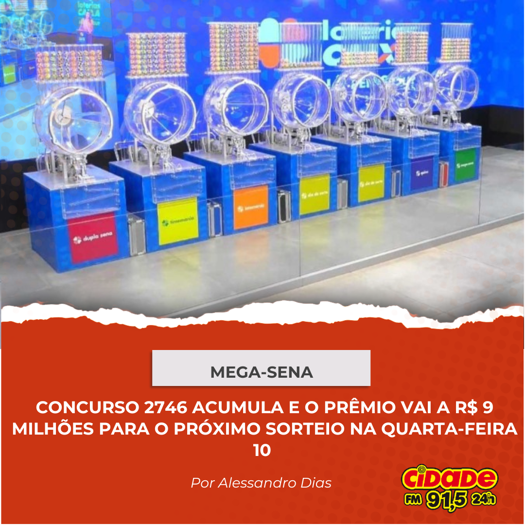 Geral ACUMULOU: PRÊMIO DA MEGA-SENA VAI A R$ 9 MILHÕES PARA O PRÓXIMO SORTEIO NA QUARTA-FEIRA 10 7 de julho de 2024 Nenhum comentário