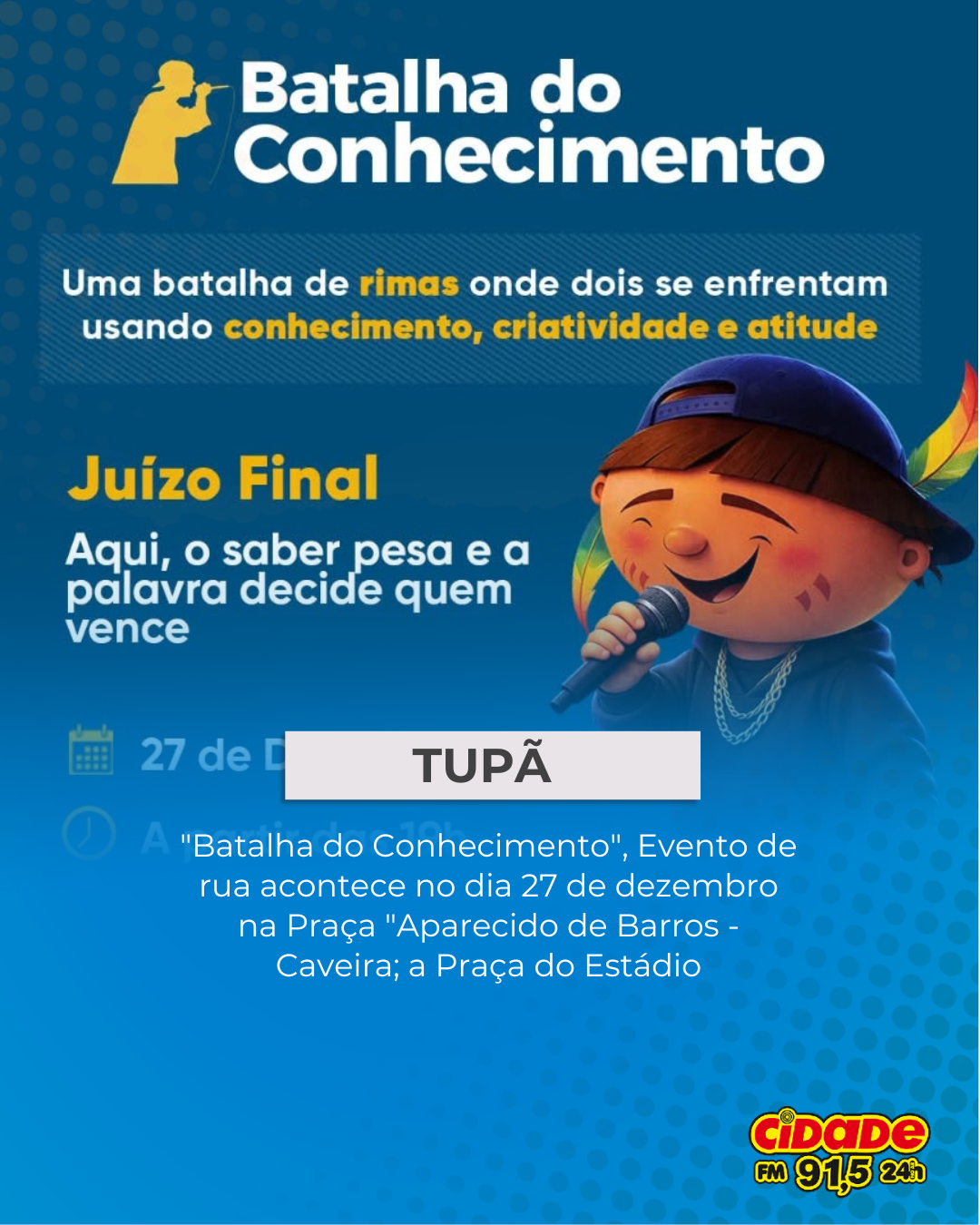 Geral TUPÃ: “Batalha do Conhecimento”, Evento de rua acontece no dia 27 de dezembro na Praça “Aparecido de Barros – Caveira; a Praça do Estádio 22 de dezembro de 2025 Nenhum comentário