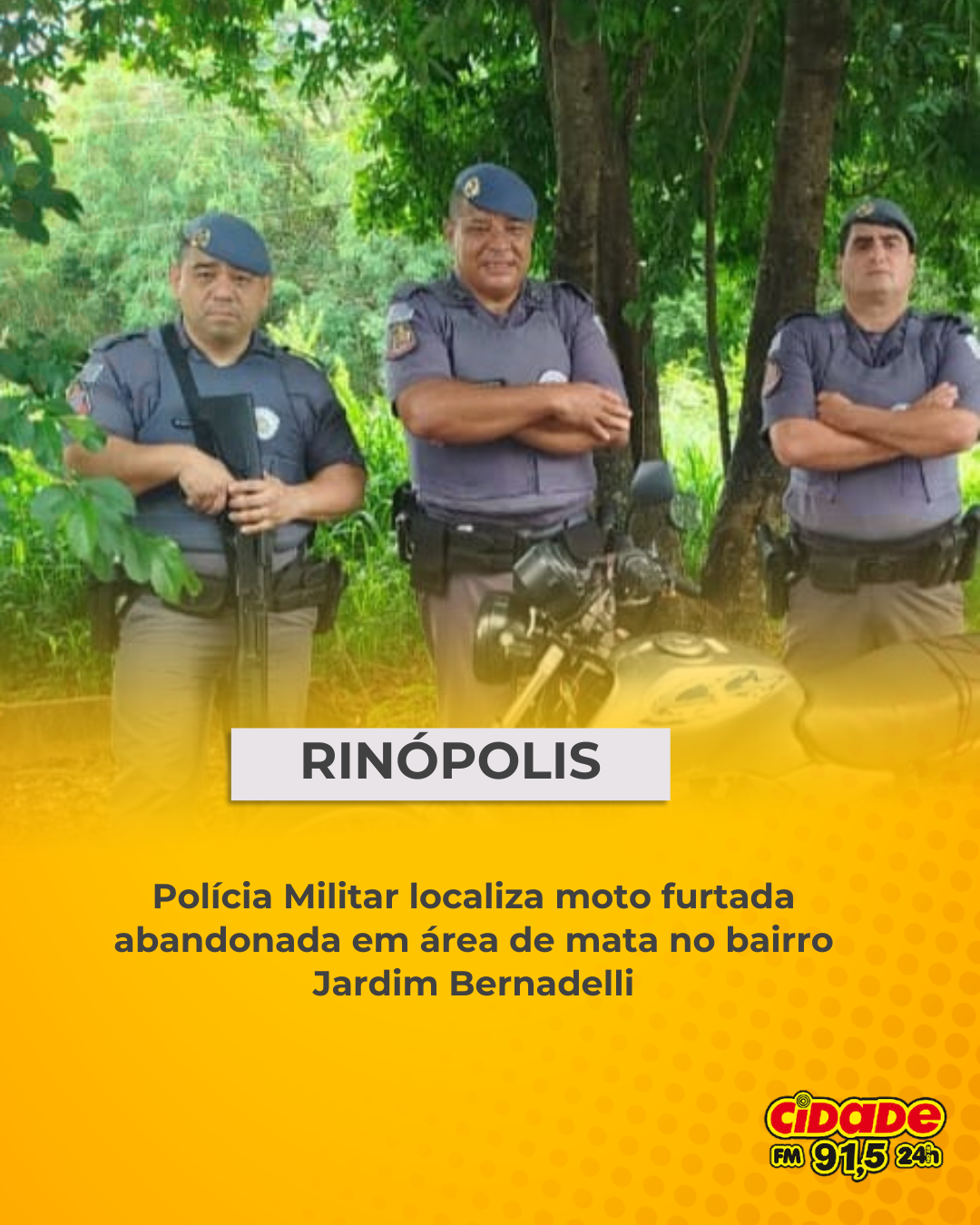 Geral RINÓPOLIS: Polícia Militar localiza moto furtada abandonada em área de mata no bairro Jardim Bernadelli 19 de dezembro de 2025 Nenhum comentário
