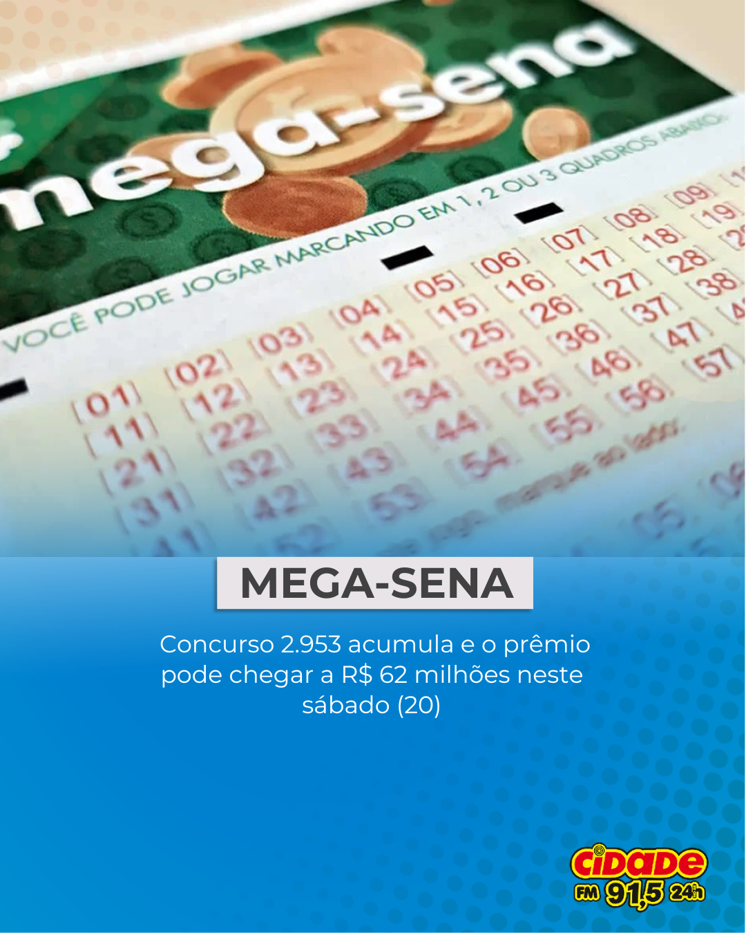 Geral MEGA-SENA: Concurso 2.953 acumula e o prêmio pode chegar a R$ 62 milhões neste sábado (20) 19 de dezembro de 2025 Nenhum comentário