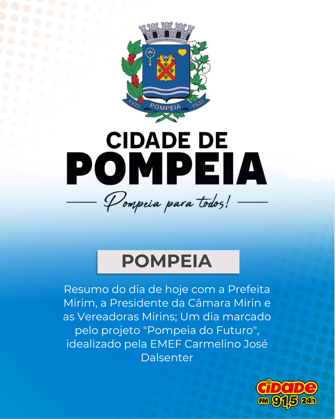 Geral POMPEIA: Resumo do dia de hoje com a Prefeita Mirim, a Presidente da Câmara Mirin e as Vereadoras Mirins; Um dia marcado pelo projeto “Pompeia do Futuro”, idealizado pela EMEF Carmelino José Dalsenter 18 de dezembro de 2025 Nenhum comentário