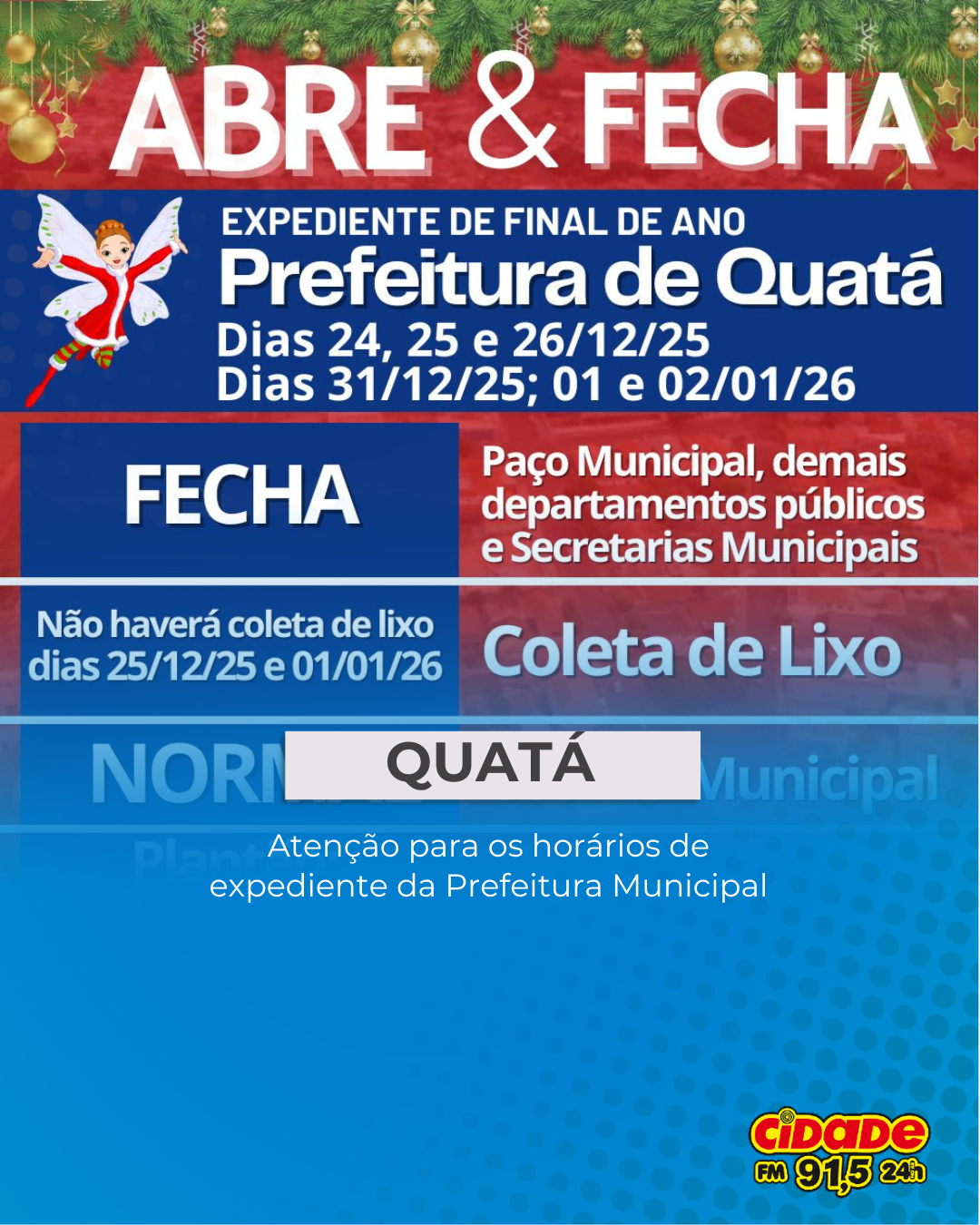 Geral QUATÁ: Atenção para os horários de expediente da Prefeitura Municipal 19 de dezembro de 2025 Nenhum comentário