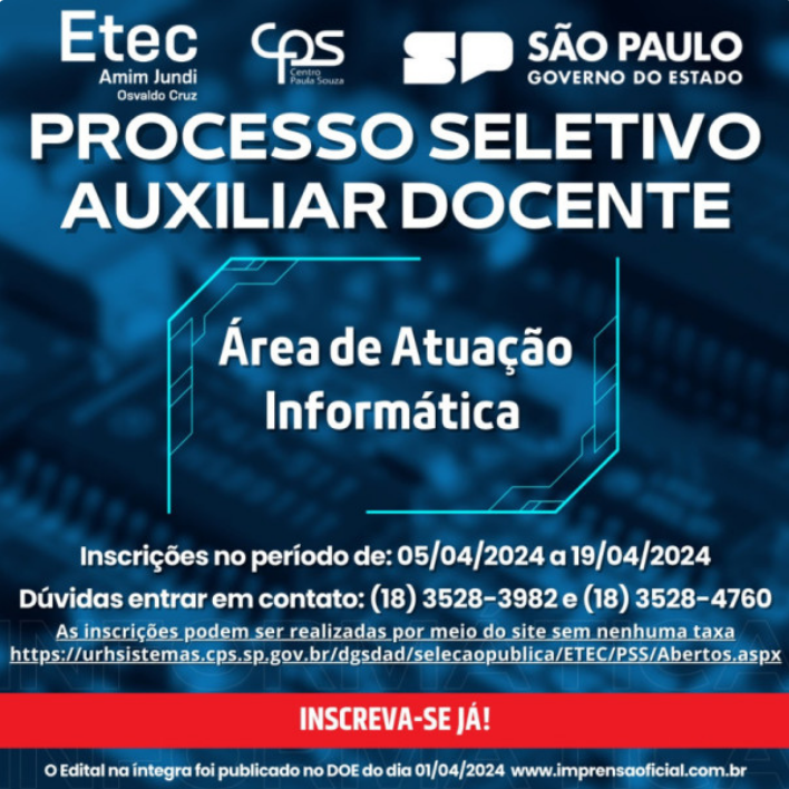 Geral ETEC-AMIM JUNDI ABRE PROCESSO SELETIVO PARA AUXILIAR DE DOCENTE NA ÁREA DE INFORMÁTICA 9 de abril de 2024 Nenhum comentário