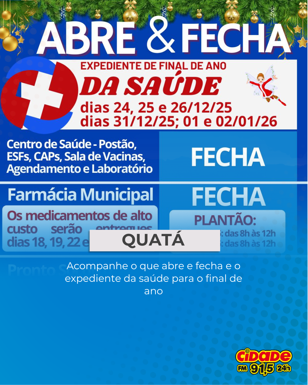 Geral QUATÁ: Acompanhe o que abre e fecha e o expediente da saúde para o final de ano 18 de dezembro de 2025 Nenhum comentário
