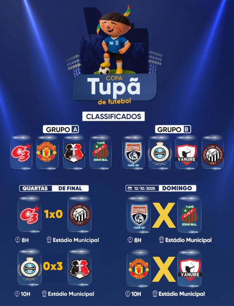Tupã, SP- Neste domingo (12), no estádio Alonso de Carvalho Braga, dois confrontos vão definir as equipes que se juntam a C3 e Lajes Tamoyo e avançam para as semifinais. Às 8h, Sumaré e CAT entram em campo e na sequência, às 10h, Manchester e Vanuíre fazem o último jogo das quartas.