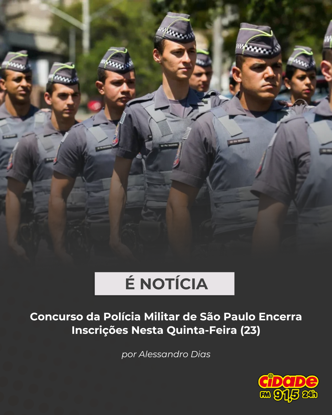 Da redação Tupã, SP- Terminam às 23h59 desta quinta-feira (23) as inscrições para o concurso público da Polícia Militar de São Paulo, que oferece 2,2 mil vagas para o cargo de Soldado de 2ª Classe. As provas objetiva e dissertativa serão aplicadas no dia 30 de novembro, à tarde, em 51 cidades — 37 em São Paulo e 14 fora do estado.