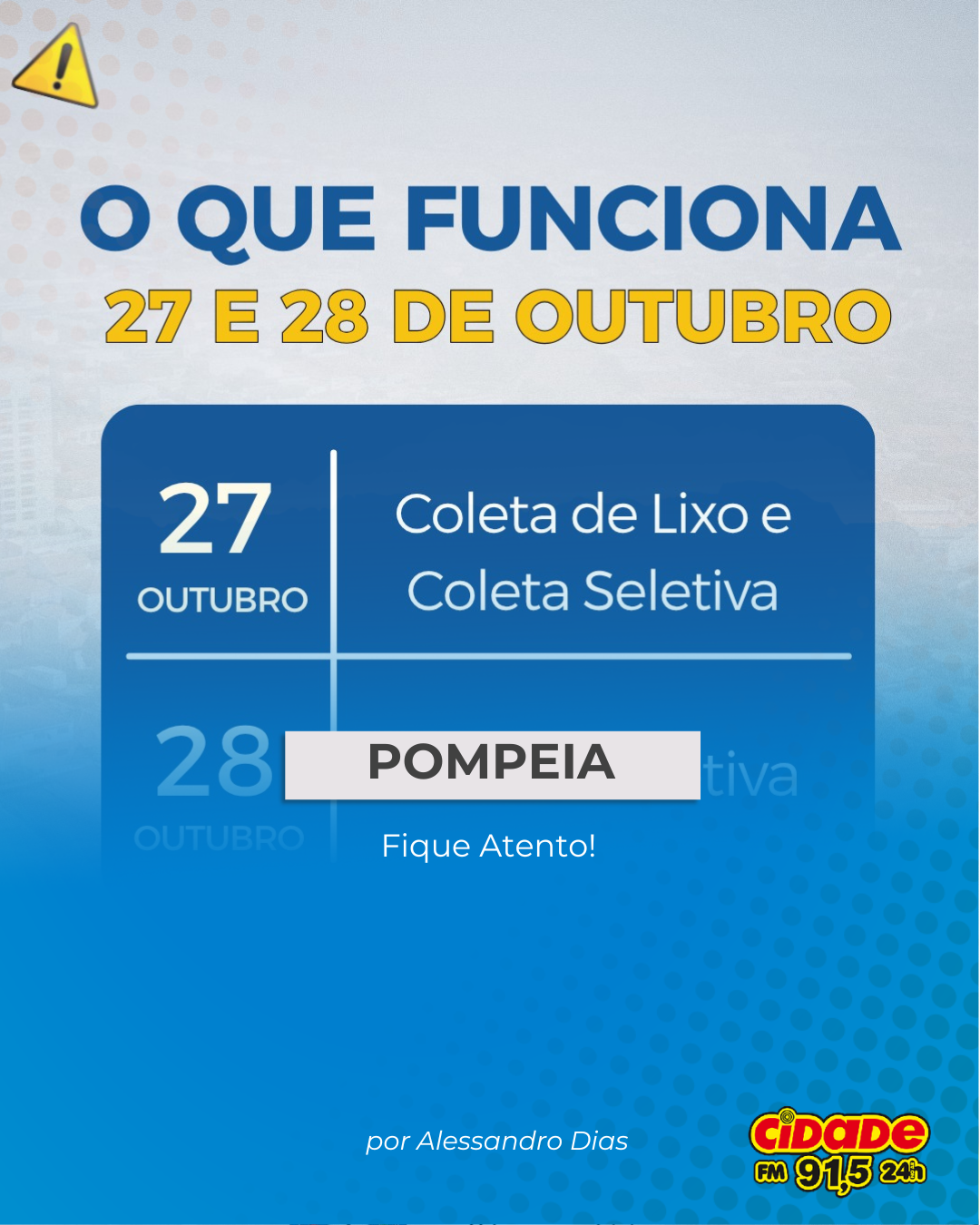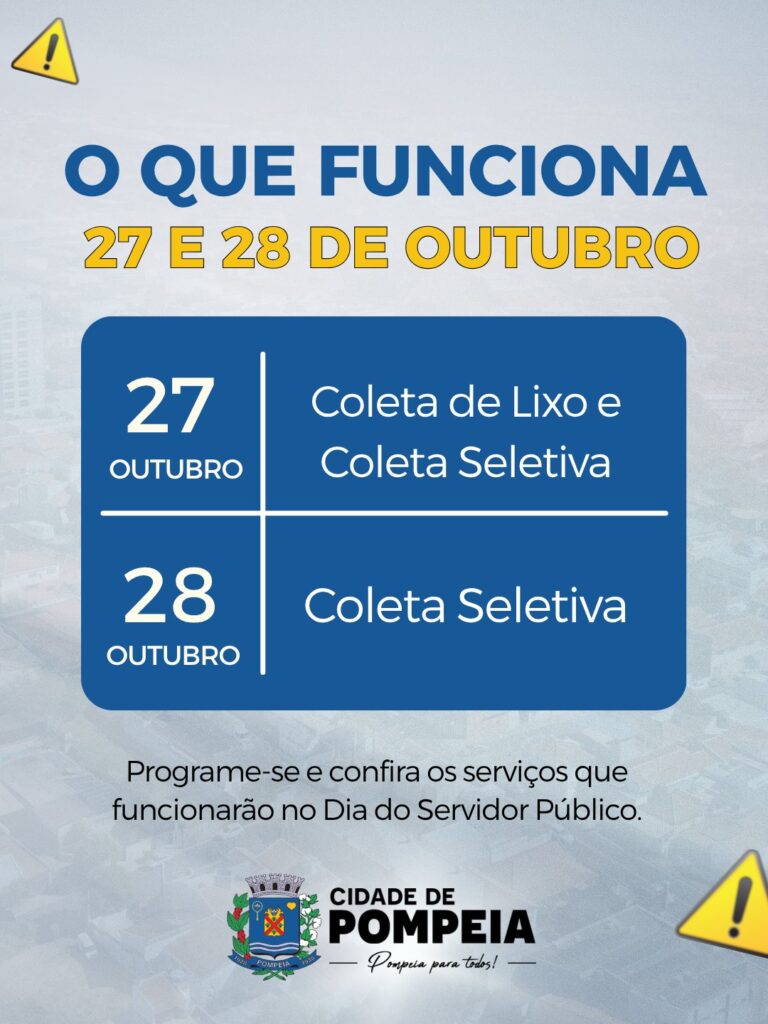 Pompeia, SP- Nos dias 27 e 28 de outubro, alguns serviços públicos de Pompeia terão funcionamento especial em razão do Dia do Servidor Público.