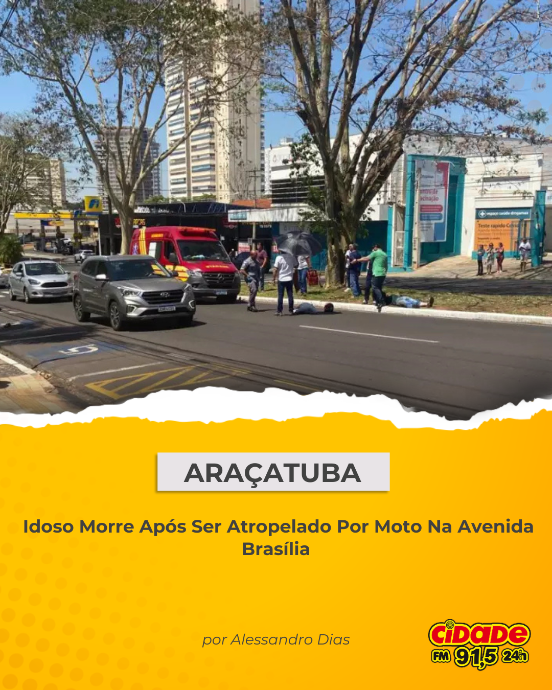 Araçatuba, SP- Um idoso de 93 anos morreu na tarde de sexta-feira (24) após ser atropelado por uma motocicleta na avenida Brasília, em Araçatuba. A vítima, identificada como Osvaldo Alves da Rocha, tentava atravessar a via em frente ao Fórum de Justiça quando foi atingida por uma moto que seguia em direção ao centro.