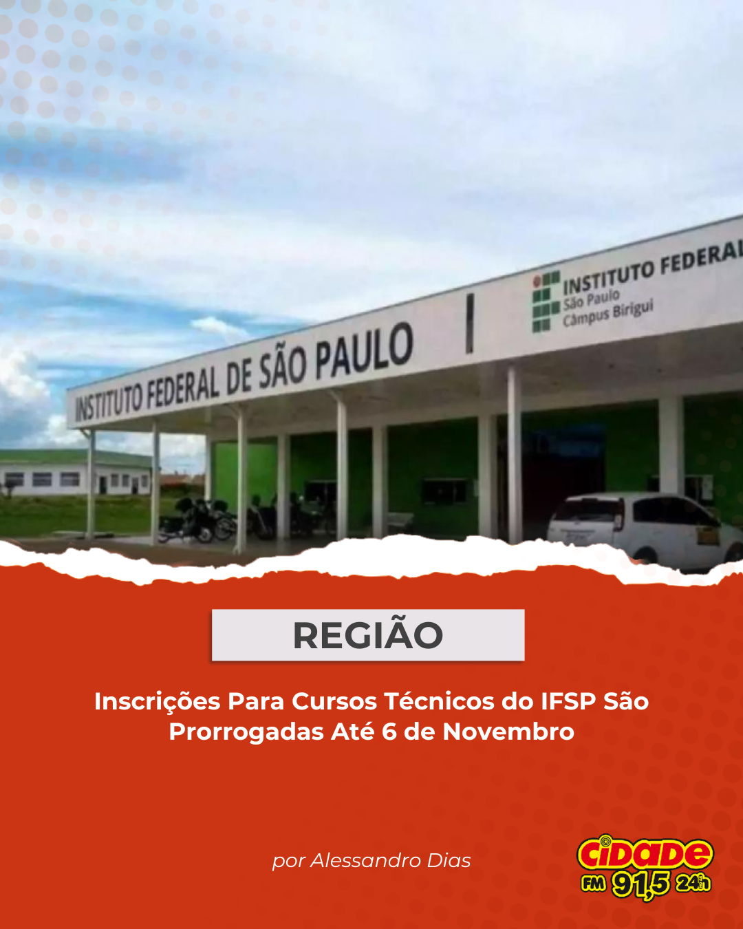 Birigui, SP- O Instituto Federal de São Paulo (IFSP) prorrogou até o dia 6 de novembro o prazo de inscrições para o processo seletivo dos cursos técnicos e integrados ao Ensino Médio com início em 2026. No campus de Birigui, são oferecidas 160 vagas totalmente gratuitas, divididas entre as modalidades Integrado e Concomitante/Subsequente.