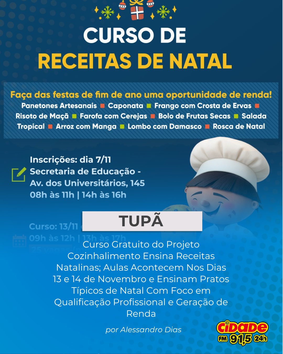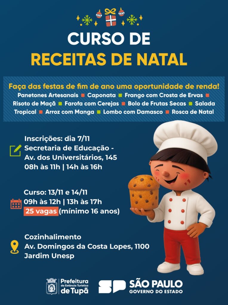 Tupã, SP- A Prefeitura, em parceria com o Governo do Estado, vai promover o Curso de Receitas de Natal do projeto Cozinhalimento. A capacitação será realizada nos dias 13 e 14 de novembro, na sede do projeto, localizada na Avenida Domingos da Costa Lopes, 1100, ao lado da UNESP, das 9h às 17h, com intervalo para almoço das 12h às 13h.