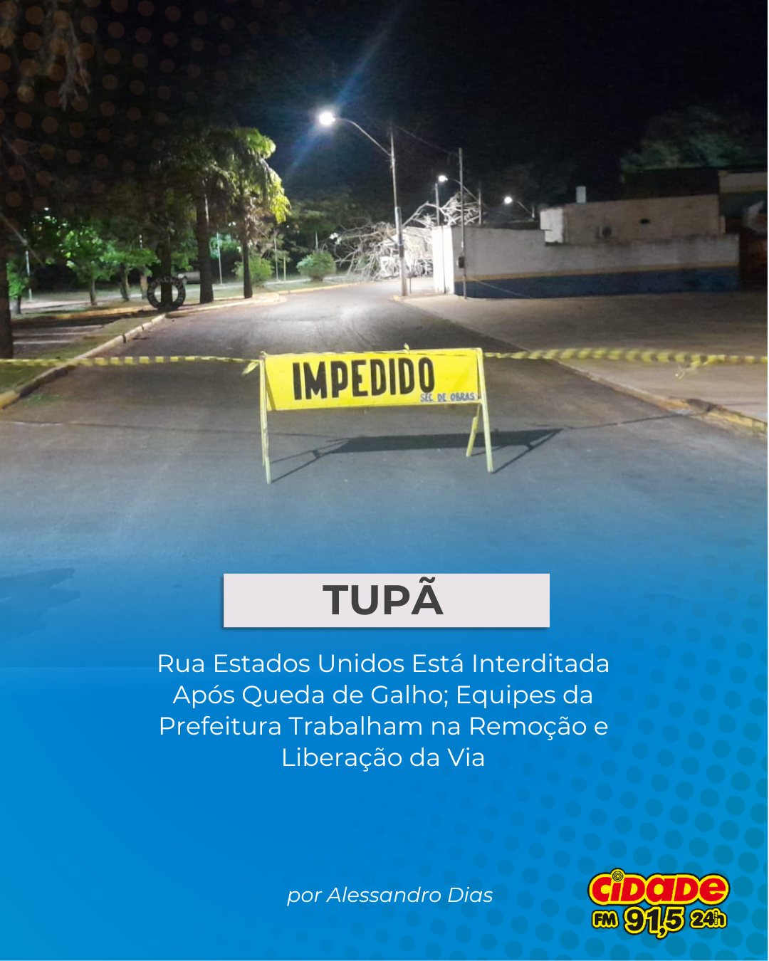 Tupã, SP- A Subsecretaria de Segurança e Trânsito informa à população que a rua Estados Unidos está temporariamente interditada devido à queda de galho de árvore de grande porte, na noite desta quinta-feira (30). De acordo com o subsecretário de Trânsito, Célio de Oliveira, a interdição, que ocorre no trecho entre as ruas Brasil e Guiomar Guandalini, é necessária para que a que Secretaria de Meio Ambiente possa cortar e retirar o galho da via. A previsão é que os trabalhos sejam concluídos ainda na parte da manhã.