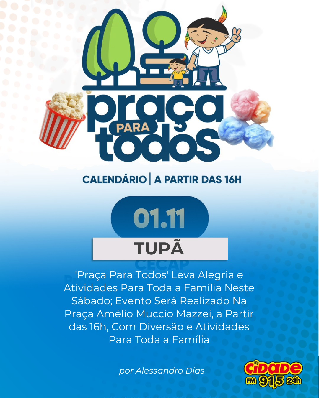 Tupã, SP- Neste sábado (01), acontece mais uma edição do projeto ‘Praça para Todos’, que desta vez será na Praça Amélio Muccio Mazzei, localizada na rua Lino Spinardi, na CECAP. As atividades começam a partir das 16h e prometem uma tarde de lazer para toda a comunidade.