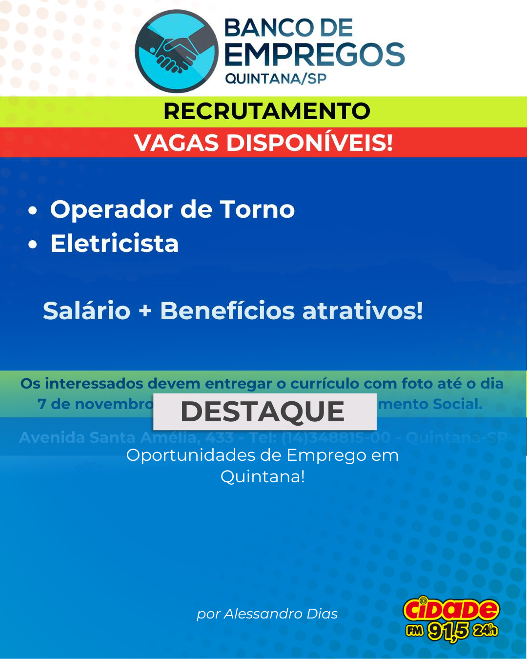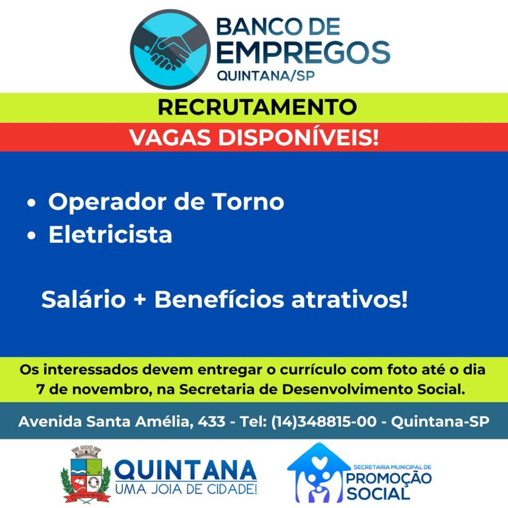 O Banco de Empregos de Quintana/SP está com novas vagas disponíveis para: