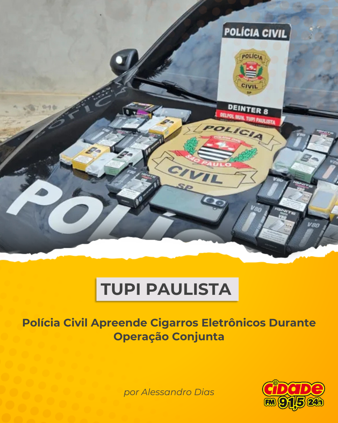 Tupi Paulista, SP- A Polícia Civil apreendeu 16 cigarros eletrônicos durante uma operação realizada nesta sexta-feira (31) em Tupi Paulista. A ação foi conduzida pela Delegacia local com apoio da DIG e DISE de Dracena, em cumprimento a mandado de busca e apreensão relacionado à comercialização irregular desses produtos.