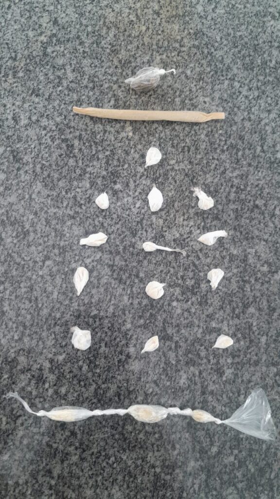 Com o homem, foram encontradas 16 porções de crack embaladas para venda, além de um cigarro e uma porção de maconha. Ele confessou que estava comercializando as drogas.
