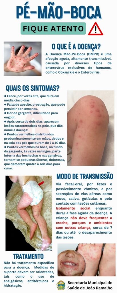 João Ramalho, SP- A Doença Mão-Pé-Boca (DMPB) é uma afecção aguda, altamente transmissível, causada por diversos tipos de enterovírus exclusivos de humanos.