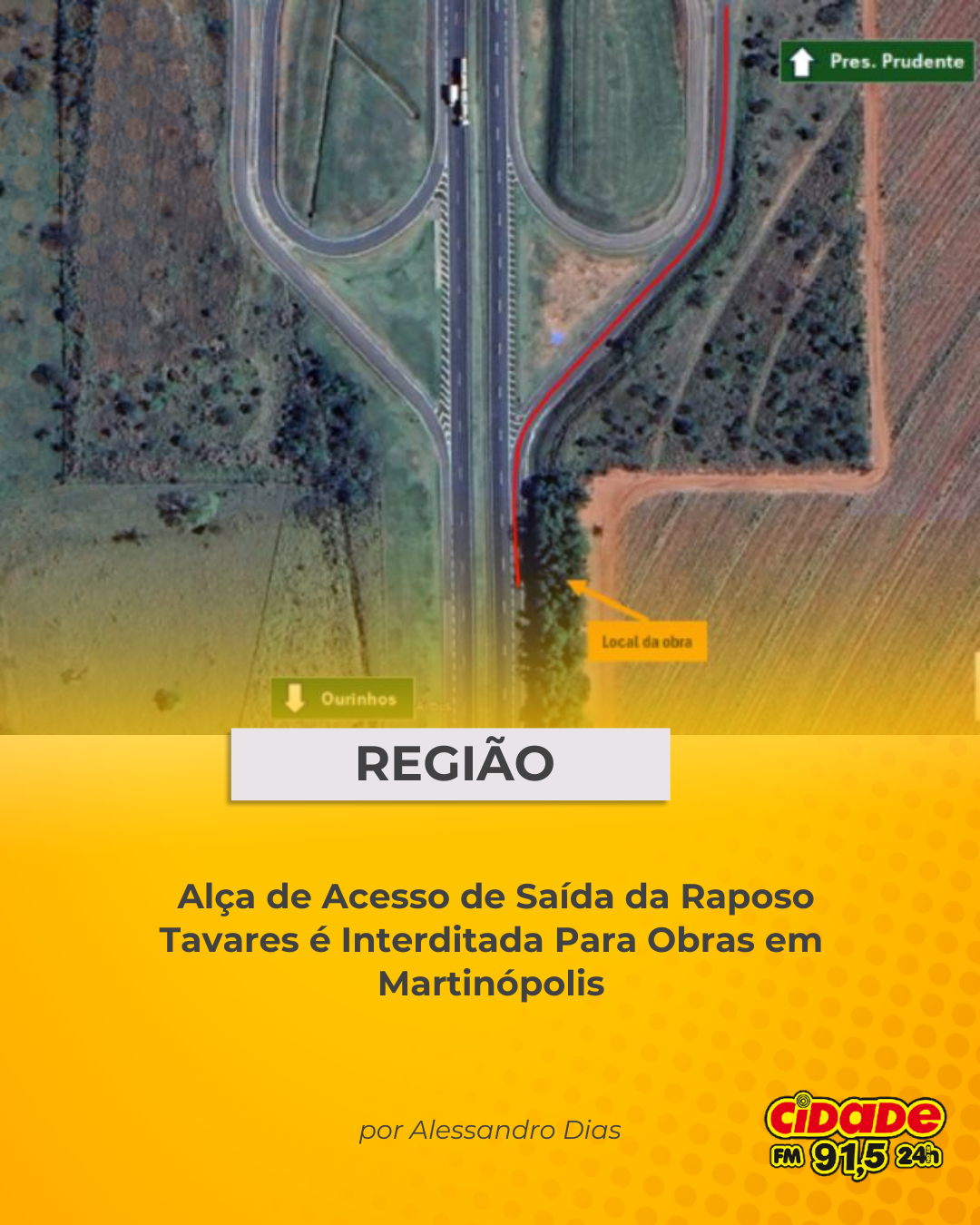 Martinópolis, SP- A alça de saída da Rodovia Raposo Tavares (SP-270), no km 527 da pista sentido Interior, em Martinópolis, está interditada nesta segunda-feira (3) para serviços de melhorias no pavimento. As obras, executadas pela CART Concessionária de Rodovias, ocorrem das 7h às 18h.