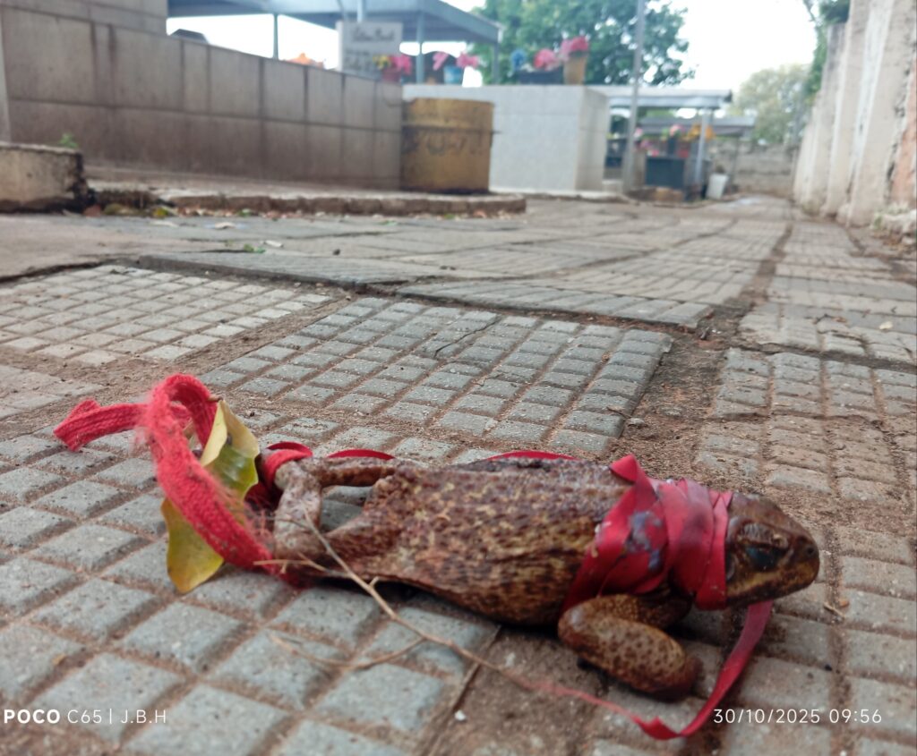 Dracena, SP- Na manhã de quinta-feira (30), um morador encontrou um sapo com as patas amarradas por uma fita vermelha e uma agulha cravada no olho no Cemitério Municipal de Dracena (SP). O caso causou revolta entre os presentes. O homem, com ajuda de outra pessoa, conseguiu soltar o animal, que estava em um corredor próximo ao muro do cemitério.