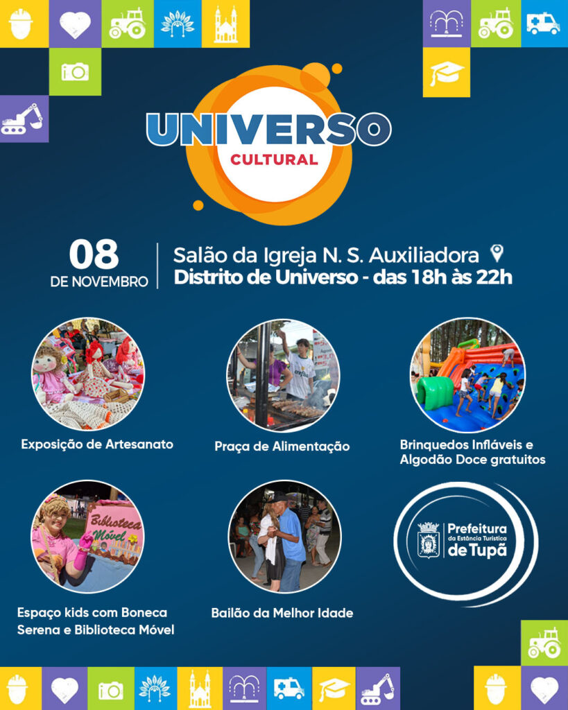 O público ainda poderá aproveitar o Bailão da Melhor Idade, garantindo animação e boa música para todas as faixas etárias. O “Universo Cultural” faz parte das ações da Prefeitura de Tupã para valorizar a cultura local, promover o lazer das famílias e fortalecer os vínculos entre os moradores dos distritos e do município.