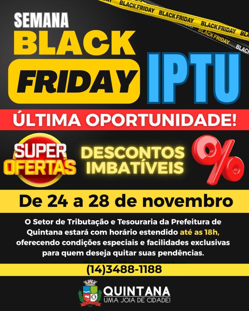 De 24 a 28 de novembro, o Setor de Tributação e Tesouraria da Prefeitura de Quintana estará com horário estendido até as 18h, garantindo mais praticidade e facilidades exclusivas para quem deseja regularizar suas pendências.