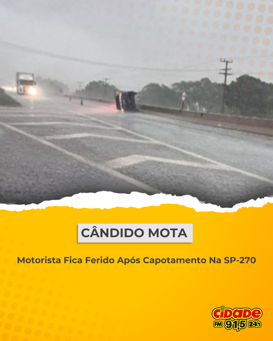 Cândido Mota, SP- Um motorista ficou ferido após o carro que conduzia capotar na Rodovia Raposo Tavares (SP-270), em Cândido Mota, na região de Assis. O veículo, um Renault Duster, seguia no sentido Assis–Ourinhos quando o condutor perdeu o controle da direção durante a chuva e capotou.