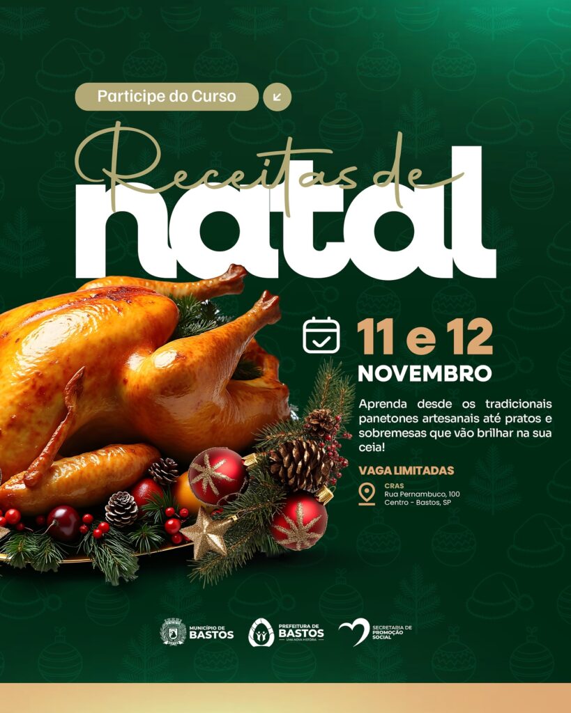 🎄 ✨Bastos, SP- A Secretaria de Promoção Social convida você para participar do Curso de Receitas de Natal, uma capacitação gratuita que vai muito além da cozinha — é uma chance real de aprender, empreender e aumentar sua renda. 👩🍳🎁