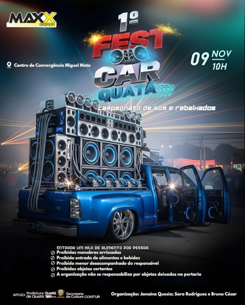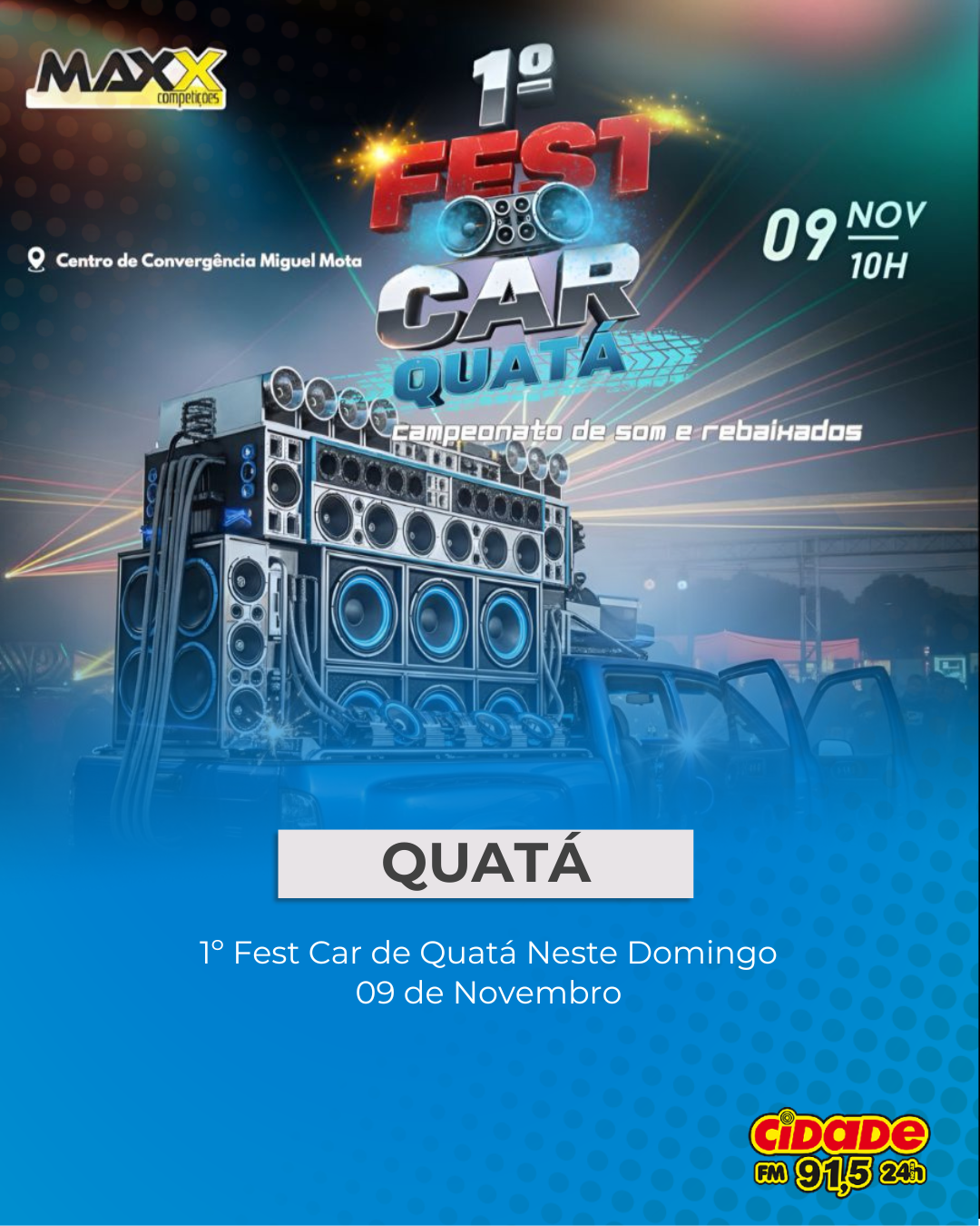 Quatá, SP- A Prefeitura Municipal de Quatá convida toda a região para prestigiar a primeira edição do Fest Car de Quatá, que acontece neste domingo 09 de novembro no Centro de Convergência Miguel Mota.