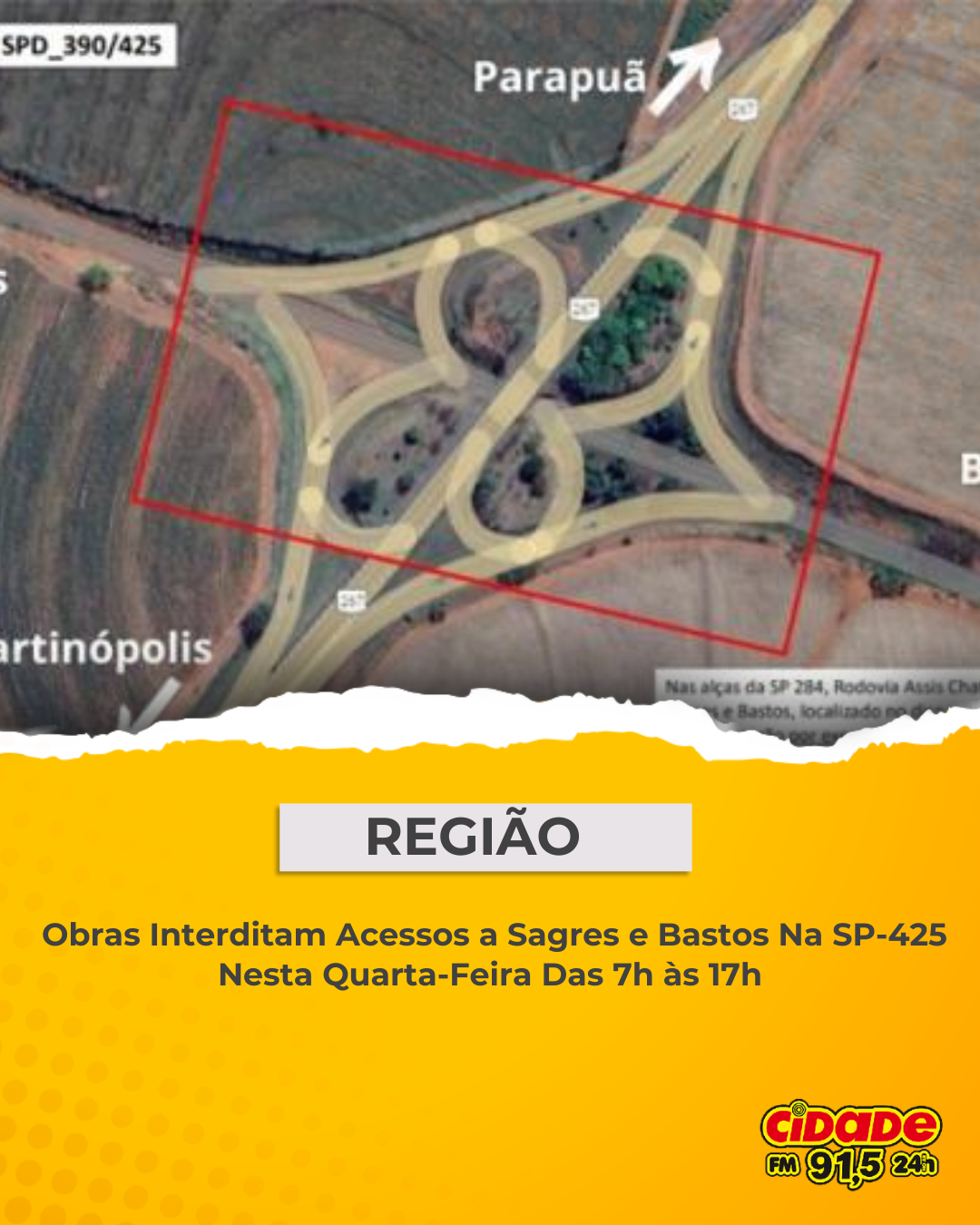 Parapuã, SP- As alças de acesso a Bastos e Sagres, localizadas no km 390 da Rodovia Assis Chateaubriand (SP-425), em Parapuã, estão interditadas nesta quarta-feira (12) para obras de melhoria no pavimento.