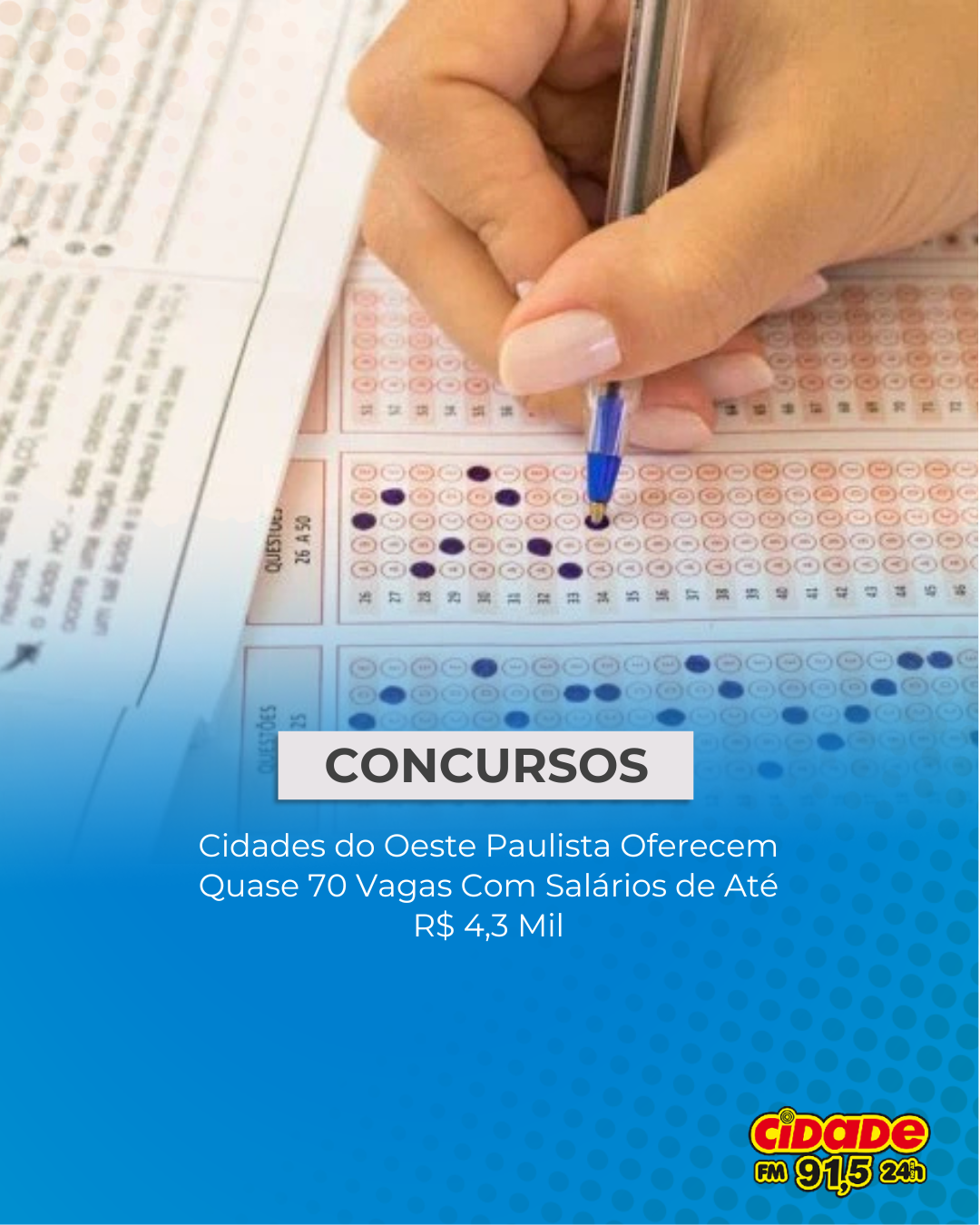 Presidente Prudente, SP- Dez municípios do Oeste Paulista estão com inscrições abertas para concursos públicos que somam quase 70 vagas, com salários de até R$ 4,3 mil. As oportunidades contemplam diferentes níveis de escolaridade e incluem contratações temporárias pelo Consórcio Intermunicipal do Oeste Paulista (CIOP).