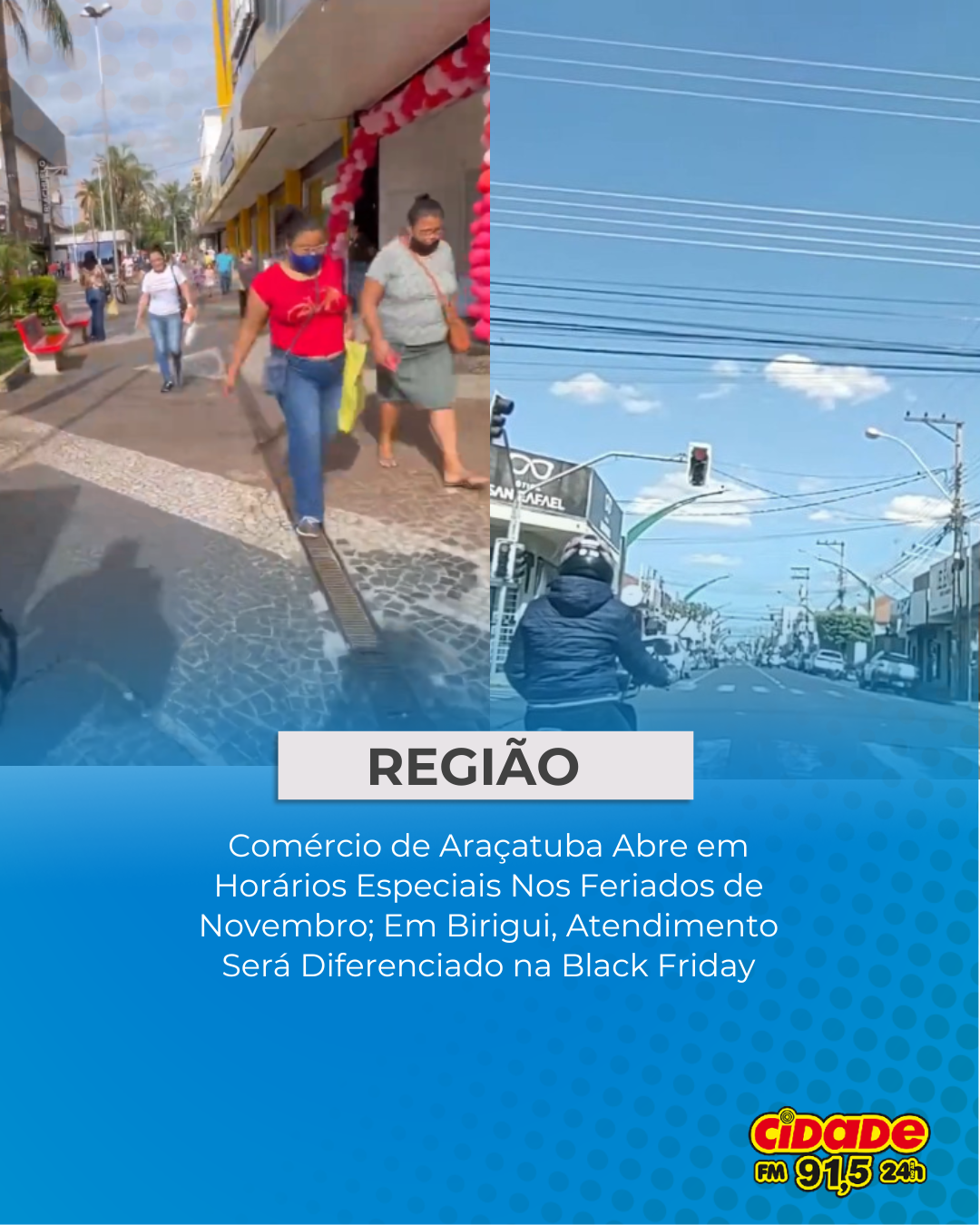 Em Birigui, a Associação Comercial e Industrial informou que o comércio permanecerá fechado nos feriados de 15 e 20 de novembro. No entanto, o município também terá horário estendido durante a Black Friday, com expectativa de forte movimentação no fim do mês.