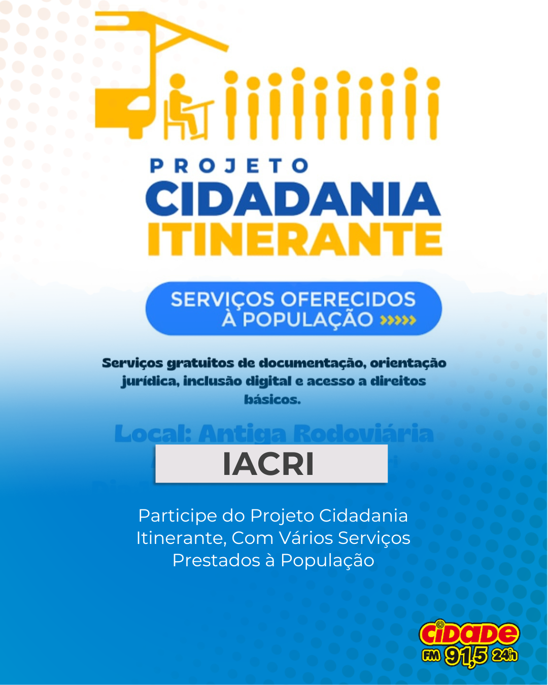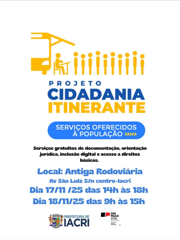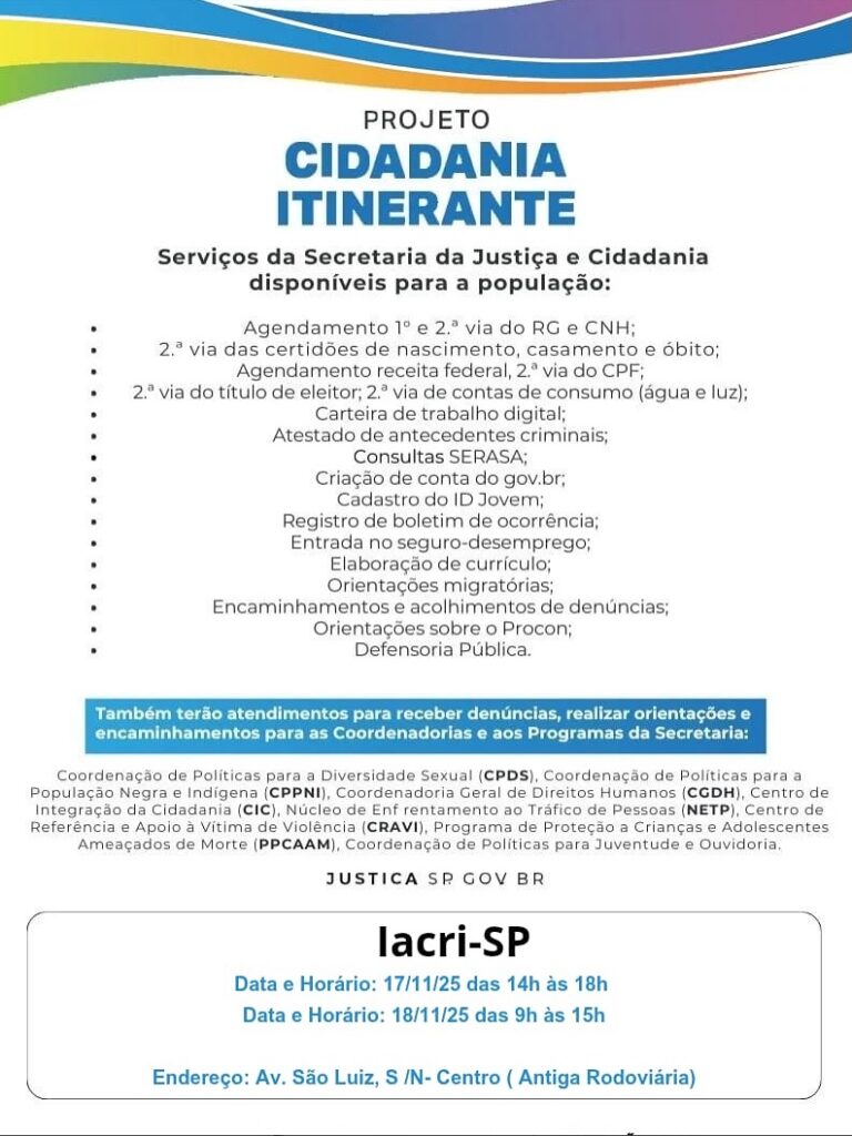 Iacri, SP- Nos dias 17 e 18 de novembro a Prefeitura Municipal de Iacri promove o Projeto Cidadania Itinerante que disponibilizará diversos serviços para a população.