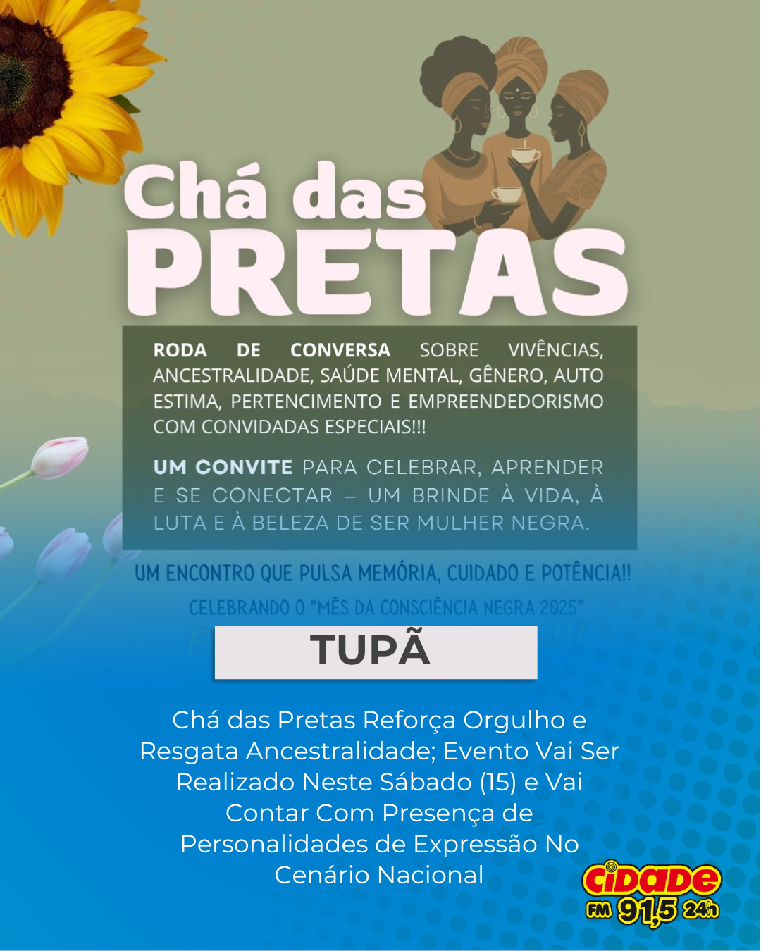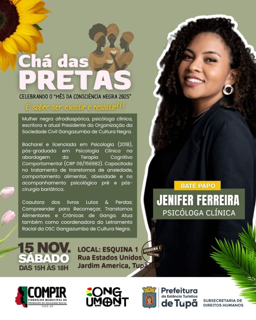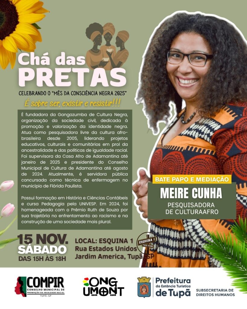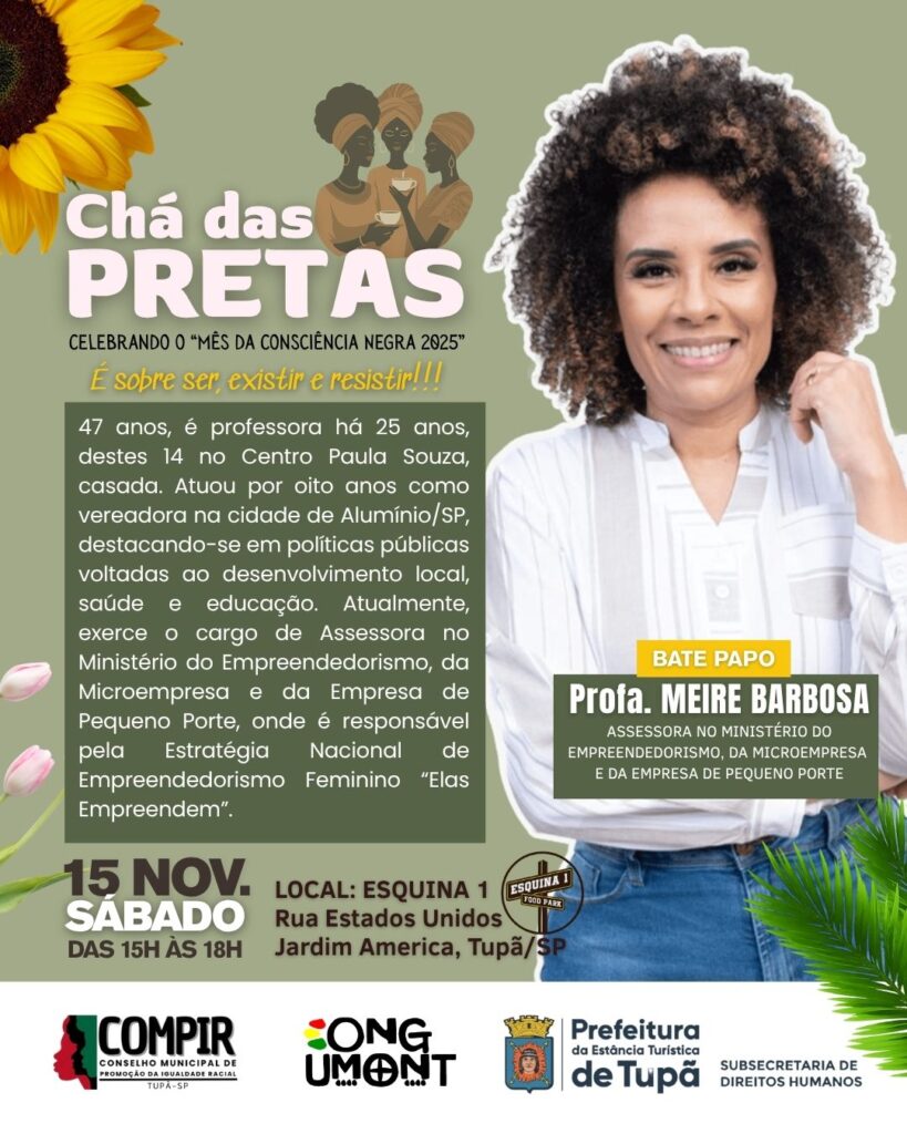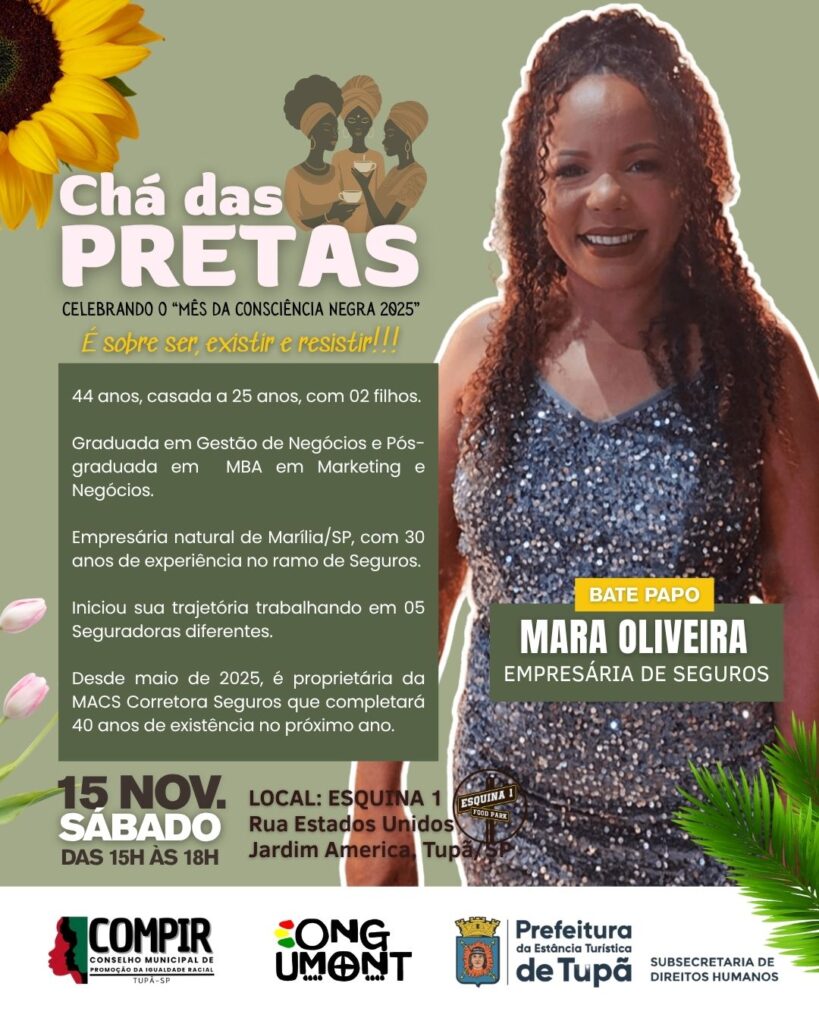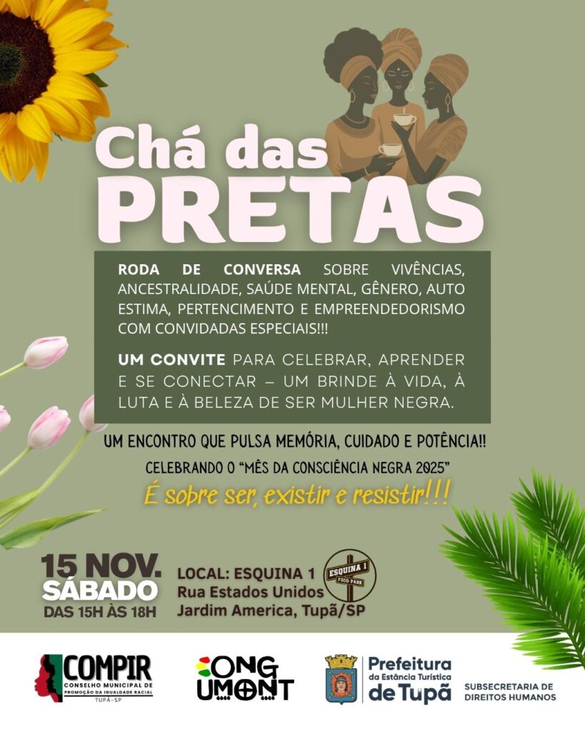 Tupã, SP- A Prefeitura está apoiando o Chá das Pretas, evento organizado pela ONG Umont para promover uma roda de conversas entre personalidades e o público para relatar experiências e vivências e falar sobre ancestralidade, gênero, pertencimento, empreendedorismo. A atividade acontece neste sábado (15), das 15h às 18h, no Esquina 1, que fica no cruzamento das ruas Estados Unidos e Guatemala.