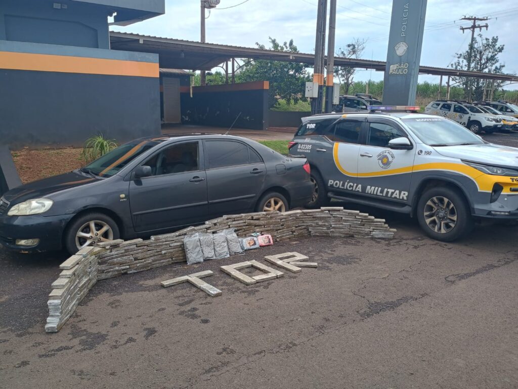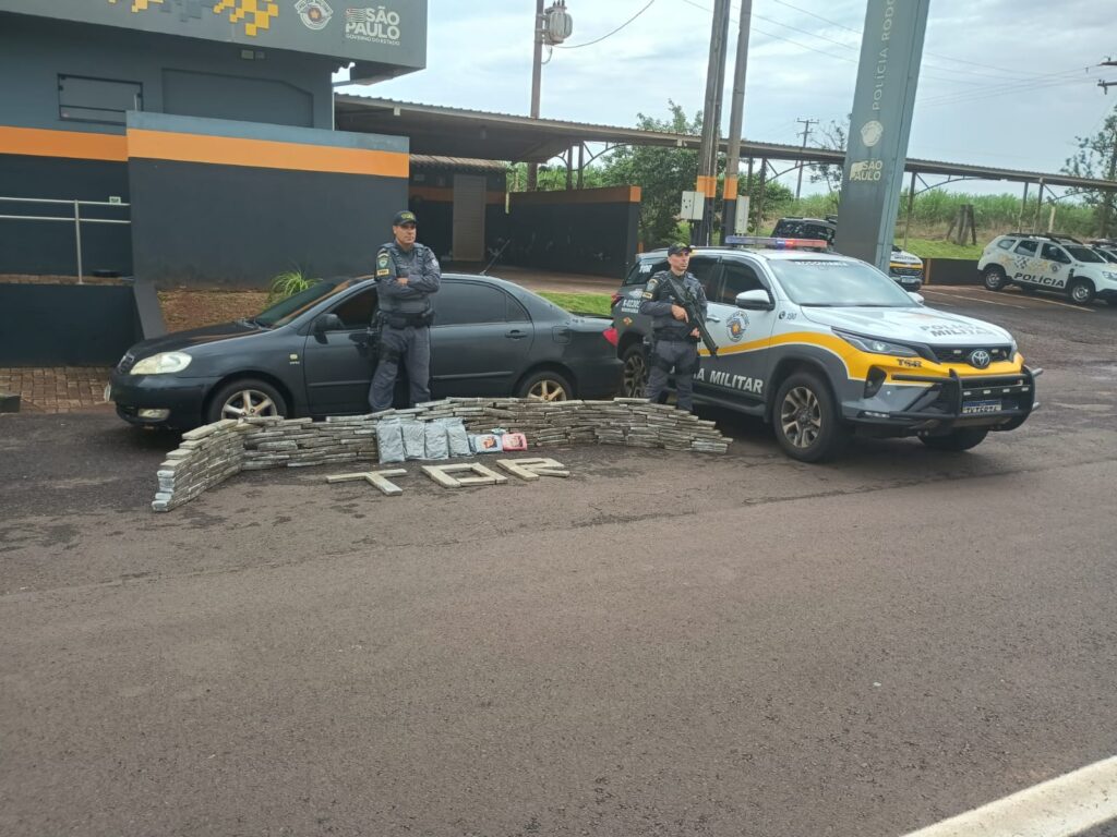 A equipe do TOR abordou um Toyota Corolla ocupado por um homem de 29 anos e uma jovem de 17, ambos do Paraná. Durante a vistoria, os policiais localizaram no porta-malas 206 tabletes de maconha, somando 156,534 kg, além de sete pacotes de skank, que totalizaram 3,172 kg.