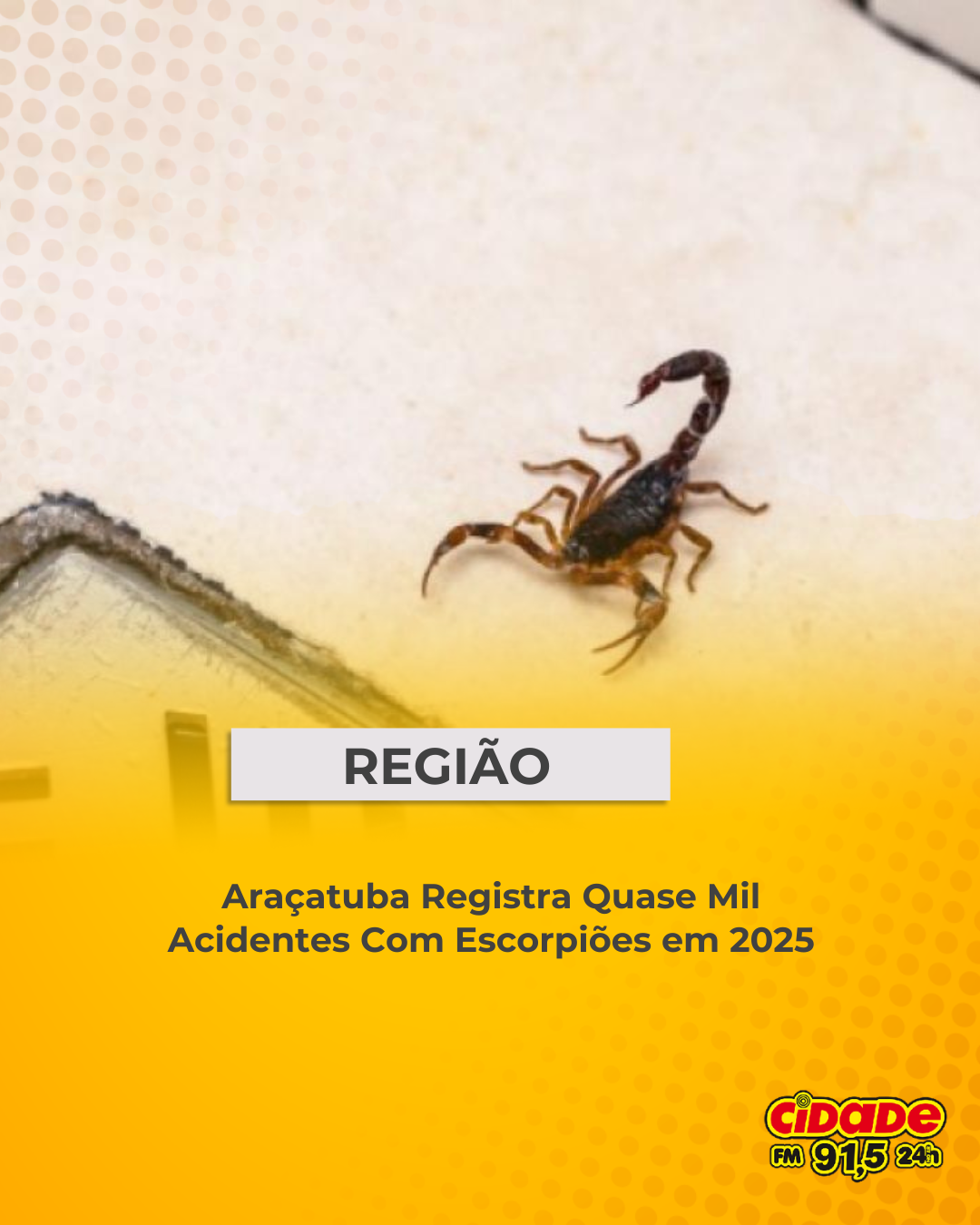 Araçatuba, SP- A cidade de Araçatuba registrou 971 acidentes envolvendo escorpiões entre janeiro e novembro de 2025, conforme levantamento divulgado pelo município nesta sexta-feira (14). O número deixa a cidade muito próxima de atingir novamente a marca anual de mil casos, repetindo o cenário de 2024, quando foram contabilizadas 1.025 ocorrências.