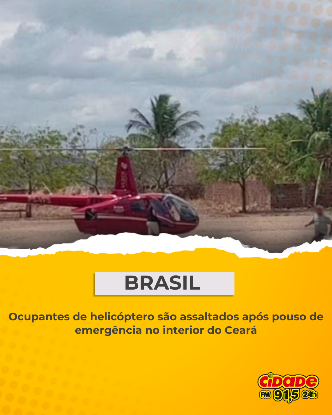 Da redação Tupã, SP- Ocupantes de um helicóptero foram assaltados após a aeronave realizar um pouso de emergência no distrito de Palmatória, em Itapiúna, no interior do Ceará, nesta quinta-feira (20). Vídeos feitos por moradores mostram o helicóptero sobrevoando a região e, em seguida, pousado em um campo de futebol.