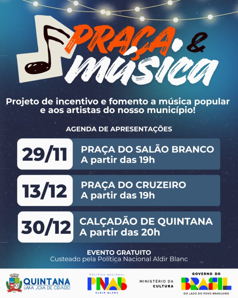 Quintana, SP- O Governo Municipal de Quintana anuncia mais uma noite especial do Praça & Música, evento que tem se consolidado como uma ação importante de promoção cultural e integração comunitária. A programação acontecerá no dia 29 de novembro, sábado, a partir das 19h, na Praça do Salão Branco, com apresentações do melhor da música popular e flashbacks internacionais.
