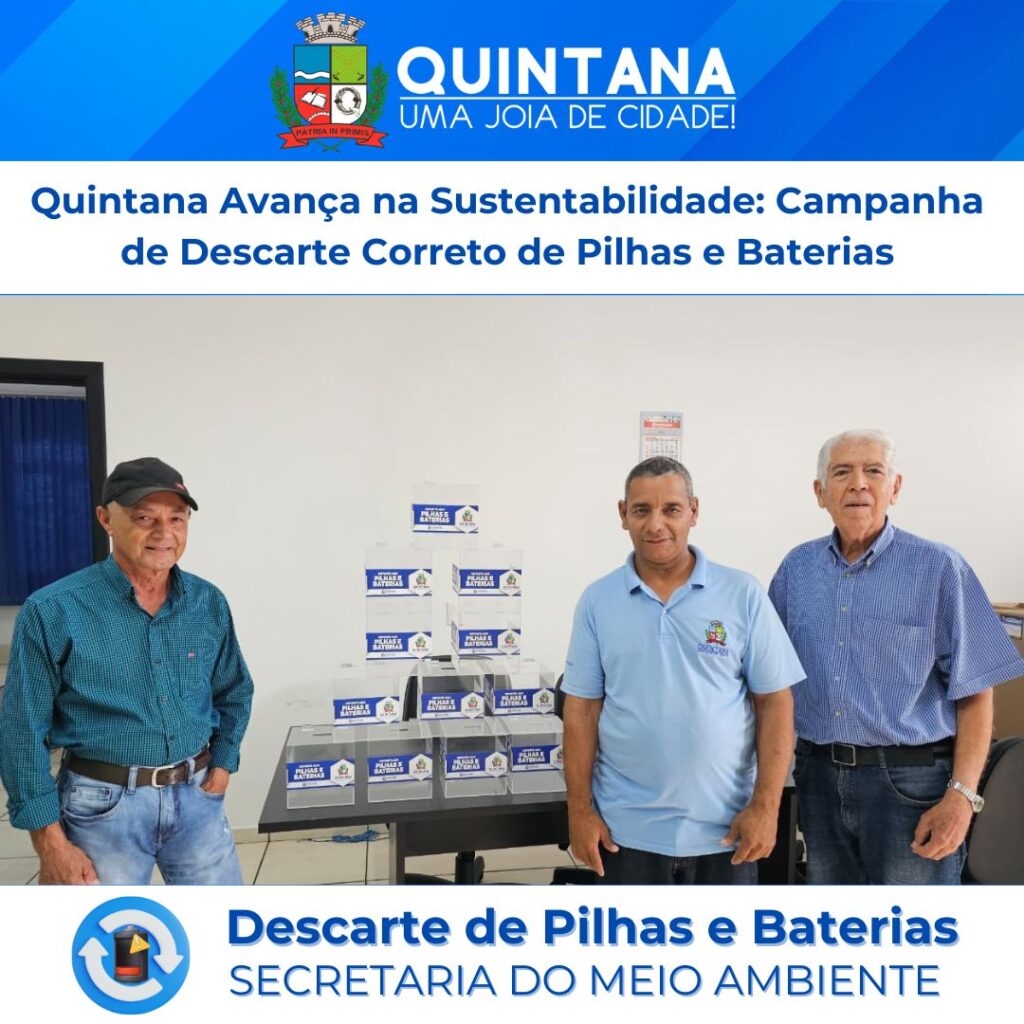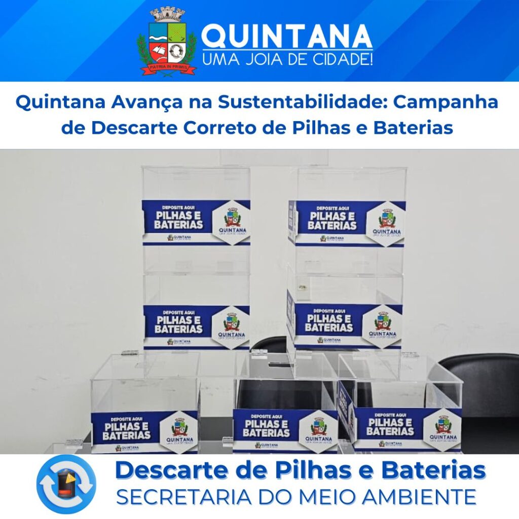 Quintana, SP- A Secretaria Municipal do Meio Ambiente, sob a liderança de José Manoel de Lima, deu mais um passo importante rumo a uma cidade mais limpa, responsável e comprometida com o futuro. A partir desta semana, diversas unidades públicas do Governo de Quintana receberão caixinhas especiais para o descarte adequado de pilhas e baterias usadas, ampliando o acesso da população a pontos de entrega voluntária e fortalecendo a consciência ambiental no município.