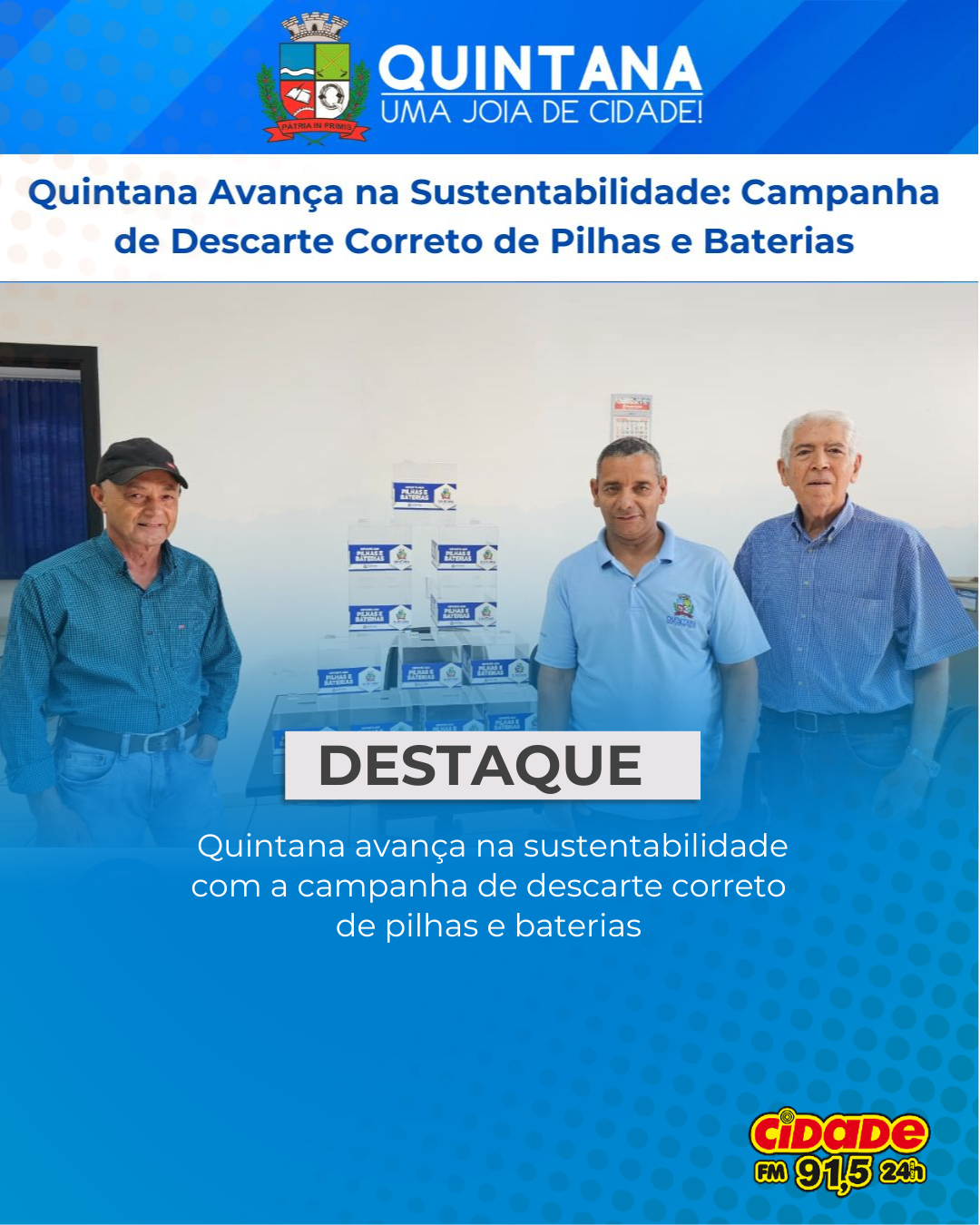 O Governo de Quintana reafirma seu compromisso com práticas que unem cuidado, planejamento e futuro. Participar é simples, rápido e faz toda a diferença! Deposite suas pilhas e baterias usadas nas caixinhas disponíveis e faça parte dessa transformação.
