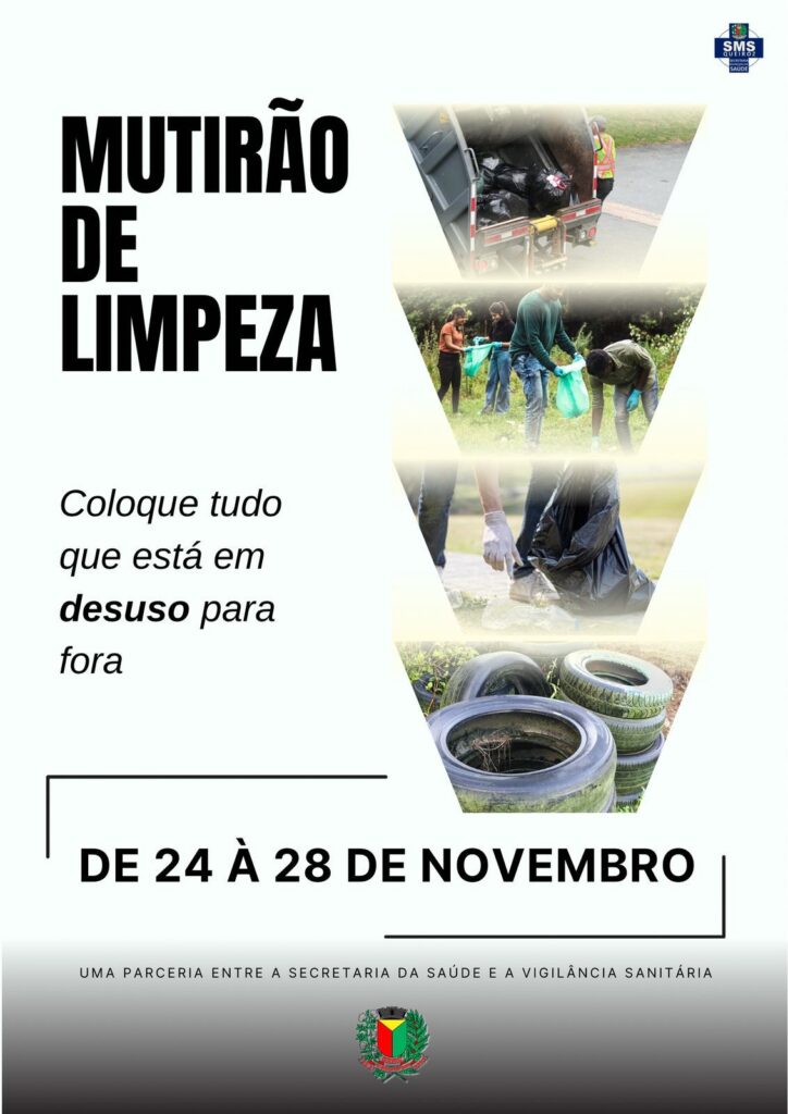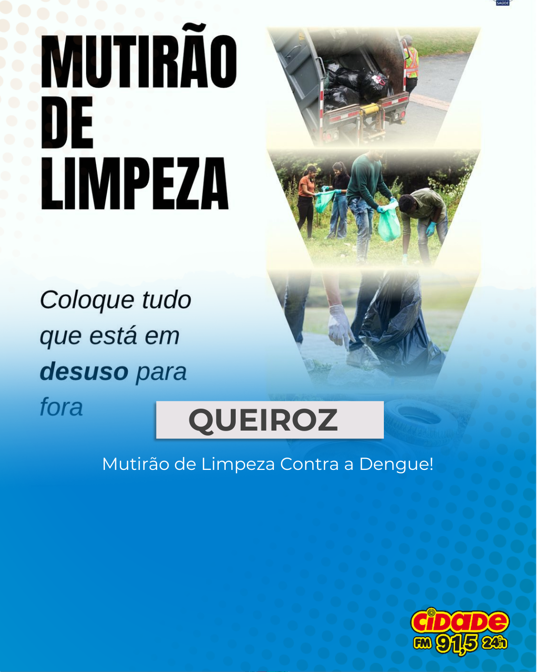 Queiroz, SP- A Prefeitura Municipal de Queiroz através da Secretaria Municipal de Saúde, comunica que entre os dia 24 a 28 de novembro a partir das 8h será realizado o MUTIRÃO DE LIMPEZA CONTRA A DENGUE!